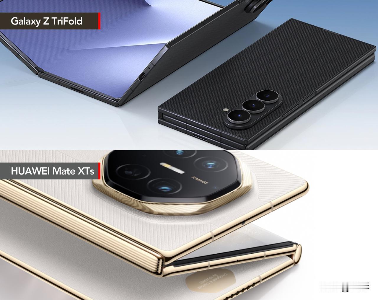 三星Galaxy Z TriFold & HUAWEI Mate XTs。 折叠区别:三星的三折不会出错,更易形成潜意识:均向内折。 三星属工业风,华为属中式轻奢。各有所长。