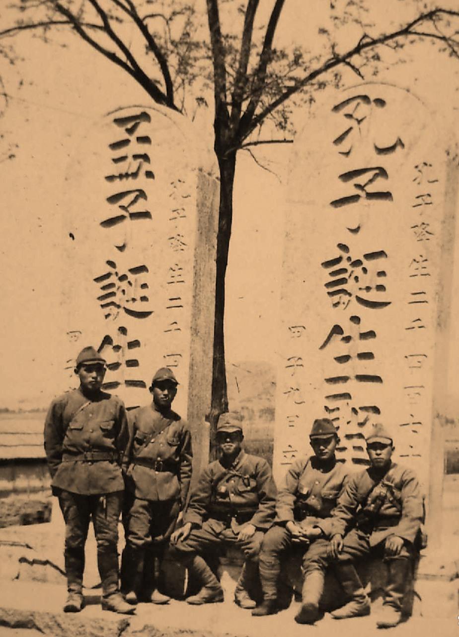 1938-1939年,日军占领山东邹县后,五个鬼子兵在邹城火车站“双圣碑”前的合影。照片是日军侵华的实物证据之一,记录了侵略者在中华文化地标前的炫耀性合影,同时也反映了当时邹城(邹县)作为交通枢纽被日军控制的状况。