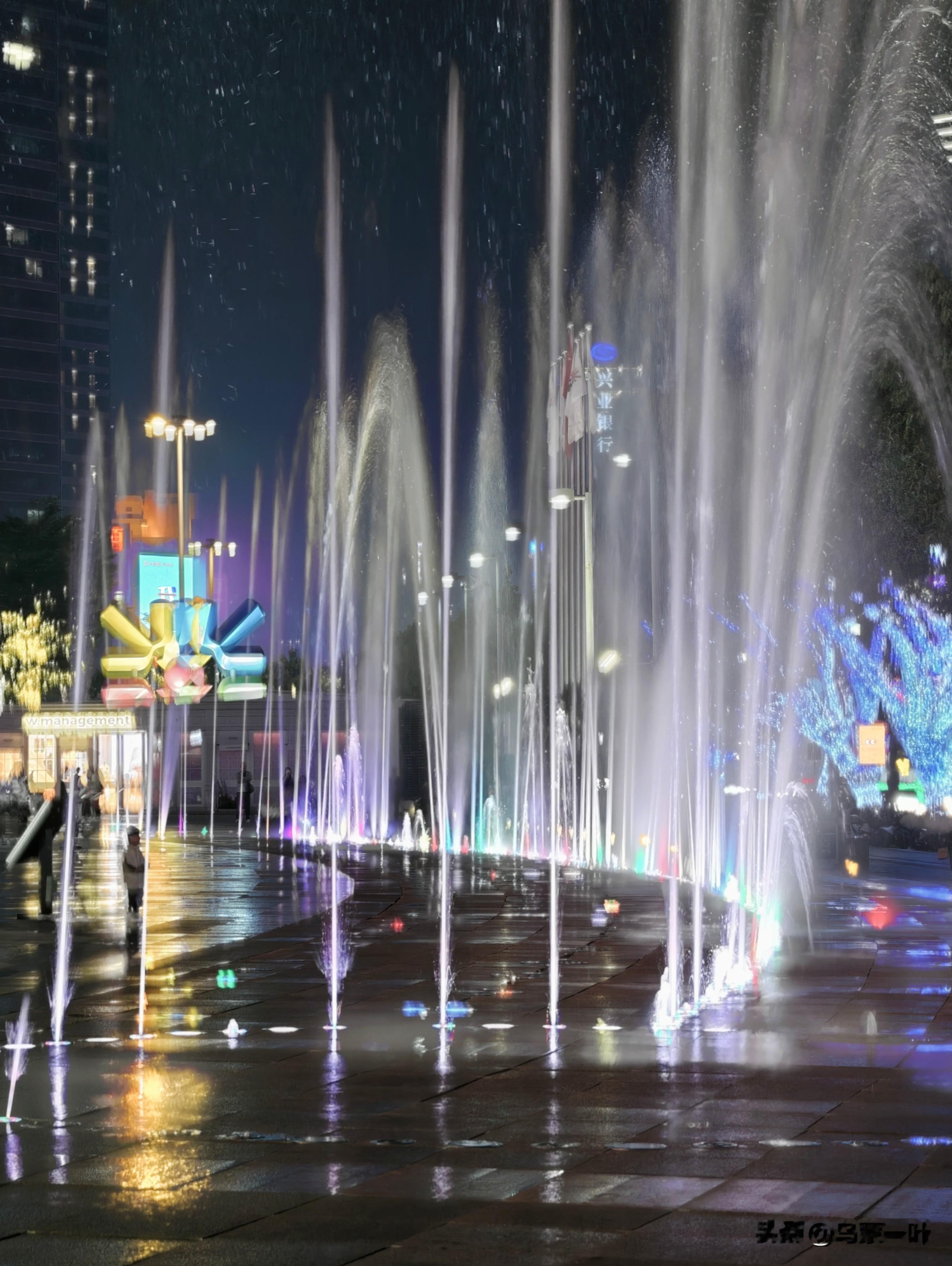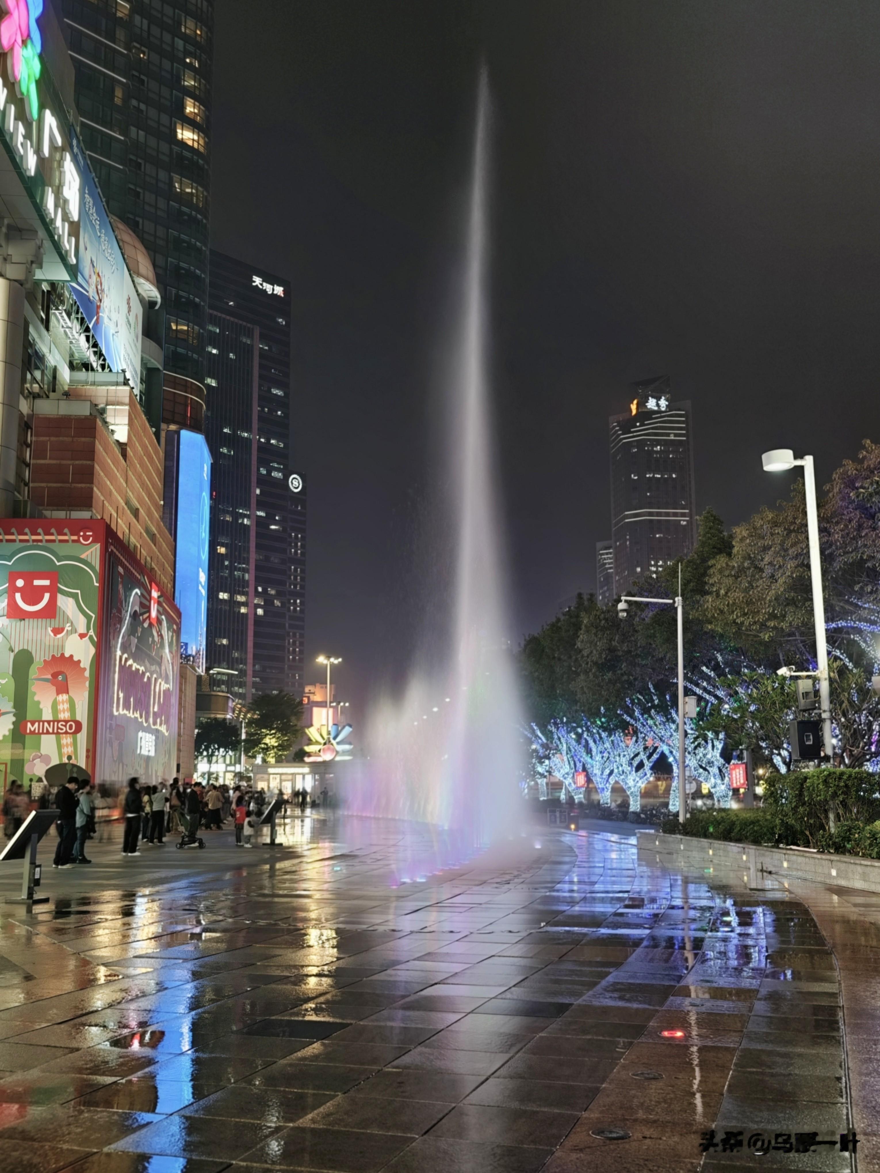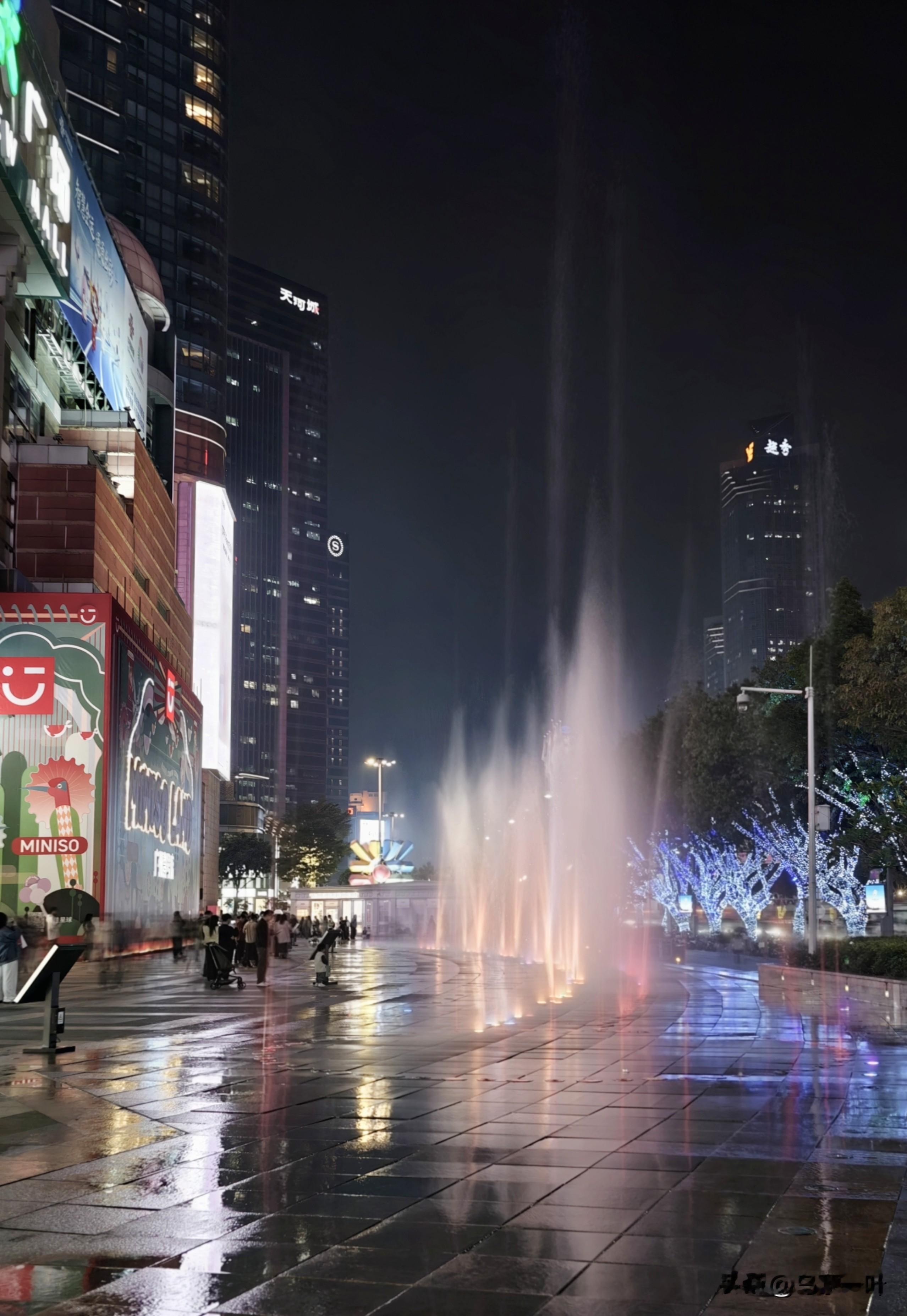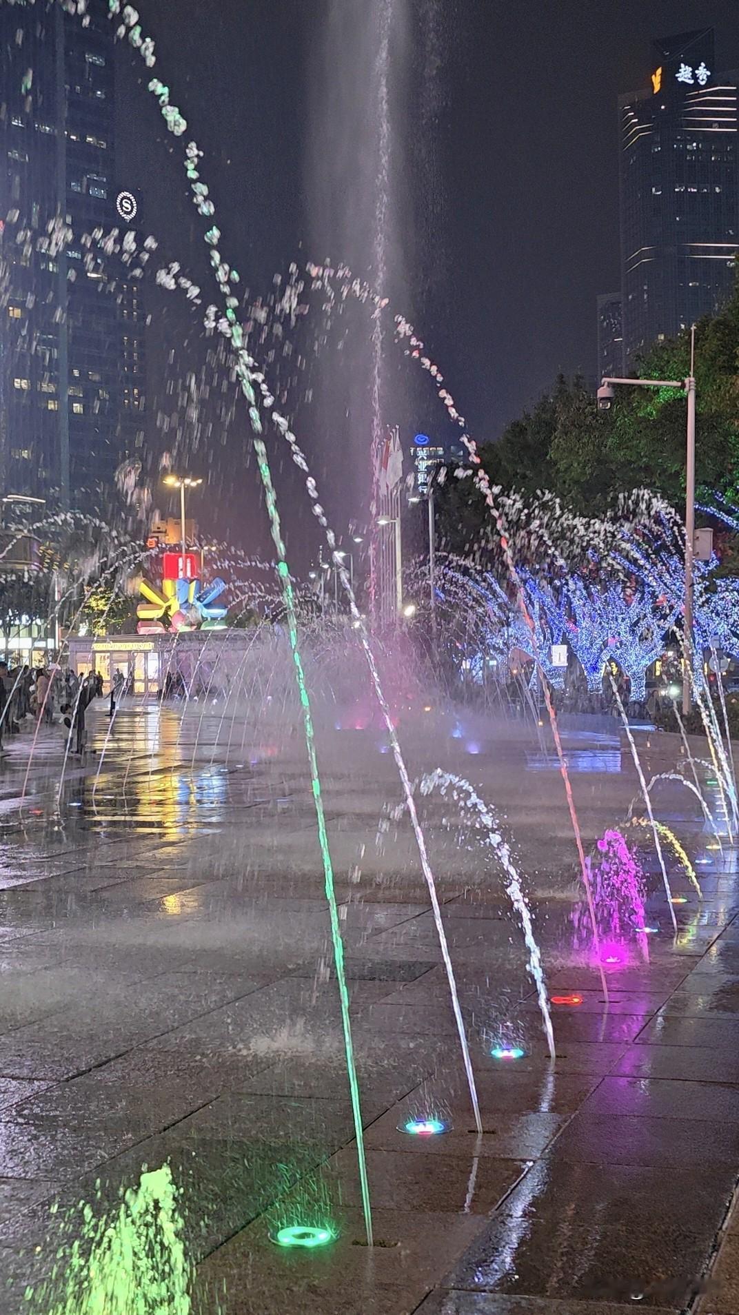 晚上夜游天河,走到正佳广场,适逢其音乐喷泉喷水时间,遂驻足观赏。水柱随音乐节律在夜色里跳舞摇曳,像一群身材细长的美女婀娜多姿,给城市的夜增添了许多美丽活力。