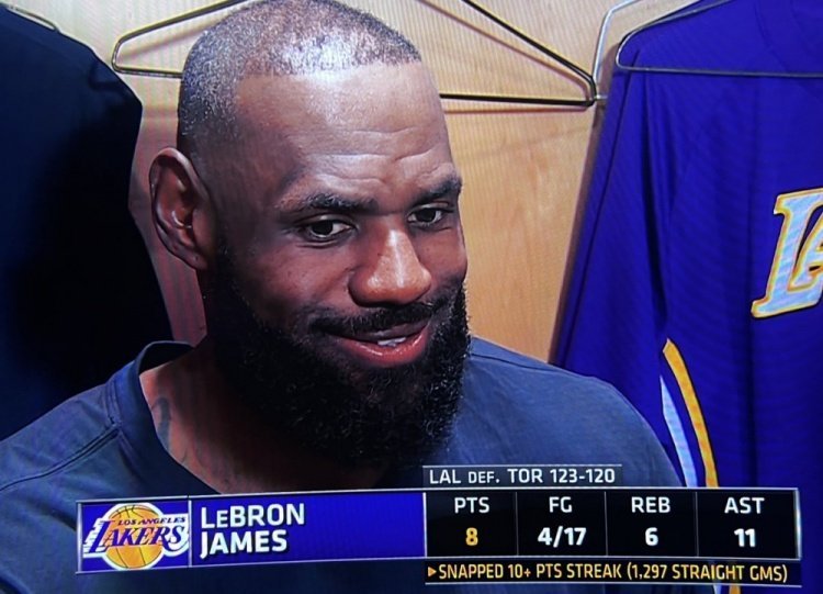 湖人123-120猛龙。赛后詹姆斯接受了采访。谈到自己连续得分上双纪录中断的感受,詹姆斯说:“没啥感受,我们赢了。”詹姆斯出战36分钟,15投仅3中,三分球5中0,得到6分5板并送出11次助攻,没有失误。此战之后,詹姆斯连续1297场上双纪录终结。詹姆斯连续得分上双纪录终结