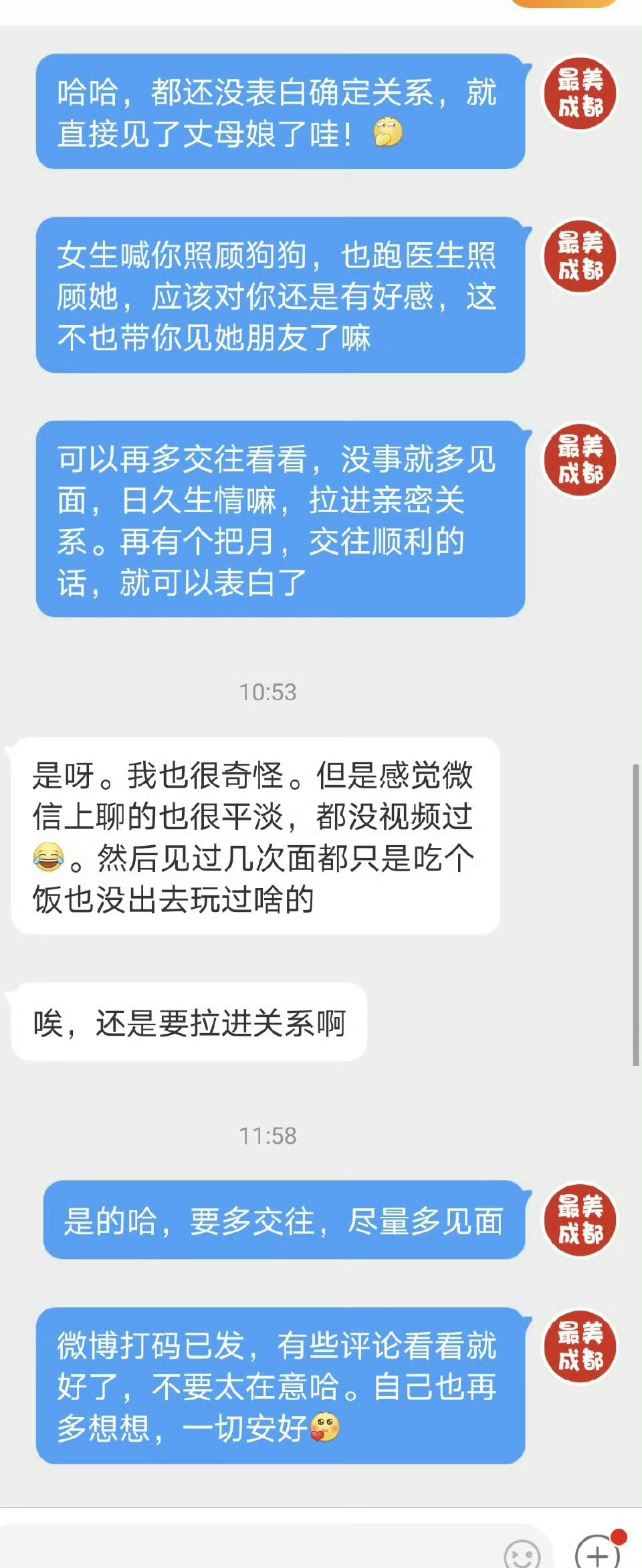 【相亲女生带我见了家人和朋友 但两人关系有点平淡不像热恋,是差一个表白吗】小美,我们平时只能周末见面吃饭,没咋出去玩过。后面有一周她生病住院,我帮她养狗狗;去医院给她送东西,遇到了她妈妈;后面她又主动带我见了朋友。现在聊天有点平淡了,不知她到底是啥态度。需要表白确认男女关系吗?很久没见过这么健康的恋爱关系了你觉得多久表白合适?亲生和亲自生的区别 成都