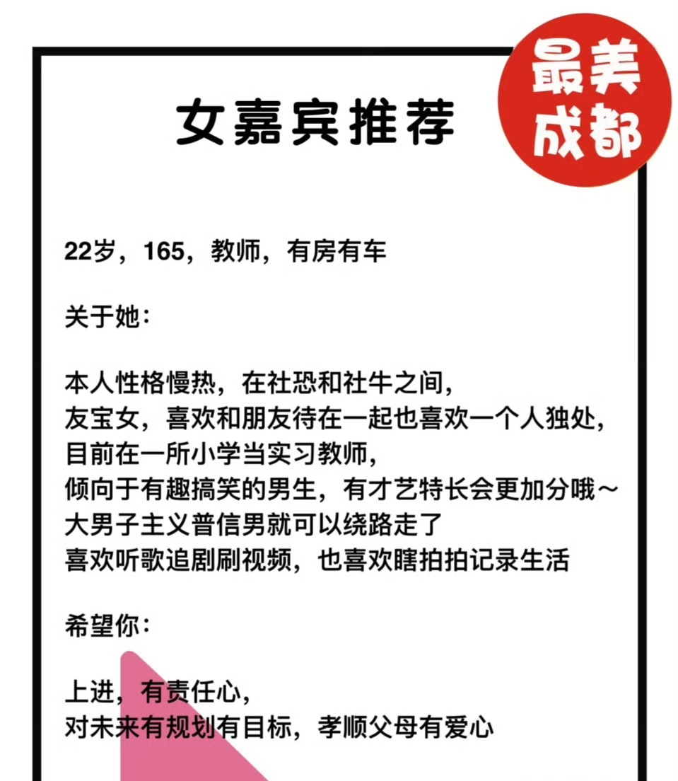 成都征婚【第7496号】03年女生,身高165,小学教师,有车有房;喜欢追剧/听音乐/记录生活。希望男生上进孝顺,有责任心,对未来有规划,有趣有才艺特长加分… 详情戳图↓特约嘉宾——有意者请私信小美! 投稿/加群/周末相亲会/小红娘1V1牵线 请私信! 成都征婚成都相亲