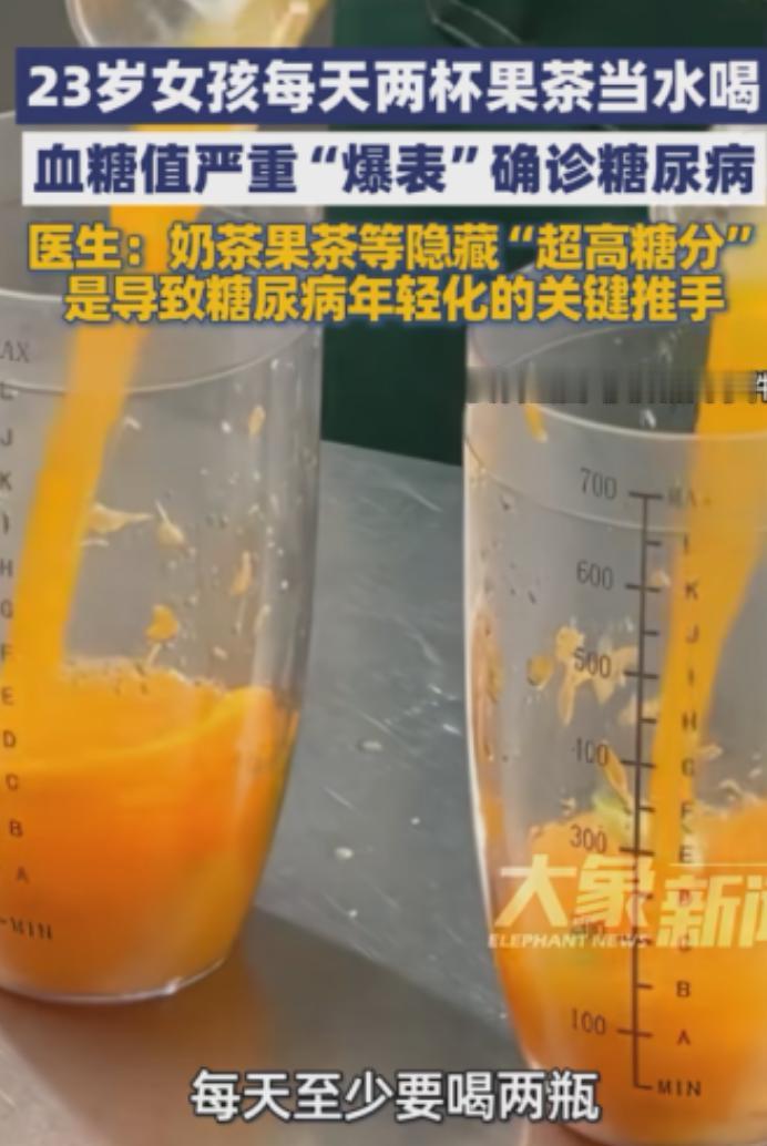 “这下后悔了吧!”近日,河南郑州,一女子每天都要喝两瓶果茶,结果没多久就胸痛心慌,口干舌燥,于是赶紧去医院检查,才发现女子的血糖值已经爆表,被确诊为2型糖尿病!而罪魁祸首,就是女子最钟爱的果茶!网友:现在戒还来得及吗? 这位姑娘叫小林,和很多在格子间打拼的年轻人一样,她刚入职没多久就被高强度的工作压得喘不过气,在她看来生活节奏快、工作压力大,唯有那一杯冰爽酸甜的果茶,能带来片刻的治愈和放松,最开始果茶只是她偶尔犒劳自己的小零食,可慢慢的,这份 “甜蜜爱好” 就变成了戒不掉的依赖。 上班打卡前,她总要先点一杯果茶 “开启元气一天”,下班走出写字楼,再来一瓶才能 “抚慰疲惫灵魂”,久而久之每天两瓶果茶成了她雷打不动的日常,甚至在她的生活里,果茶彻底取代了白开水,成了身体水分的主要来源。 中途她其实也察觉到过不对劲,心里也曾冒出过 “少喝点” 的念头,可没果茶的日子里,那种心里空落落的难受劲抓心挠肝,最终还是向自己的欲望投降了,依旧保持着每天两瓶的频率。 身体的警报总是悄无声息却又来势汹汹,小林从没想过自己天天喝的 “解渴神器”,会悄悄在体内掀起一场糖分风暴,没过多久她的身体就开始频繁发出诡异的求救信号,明明手里一直捧着果茶,可嘴里的口干舌燥却怎么都压不下去,嗓子眼干得像要冒烟,明明是年轻力壮的年纪,可就算只是在楼下随便走两步路,都会莫名气喘吁吁,心脏还会像揣了只乱撞的小鹿,伴随着阵阵胸痛心慌,整个人被一股深不见底的疲惫感牢牢裹住,连工作时都提不起半点精神。 如果不是家人反复催促,小林可能还会傻乎乎地以为是工作太累,想着再喝杯果茶缓解一下 “虚脱感”。直到她终于踏进医院大门,检查仪器上的读数让经验丰富的医生都忍不住咋舌,她的血糖值已经远远超出正常范围,直接到了 “爆表” 的程度,医生当即就给出了 2 型糖尿病的确诊通知。 医生告诉小林,那些她以为清爽解压的果茶,实则是往血管里灌注的 “隐形糖浆”,市面上的果茶为了保证口感,往往会添加大量糖分,长期把它当作日常饮品,胰岛细胞早就不堪重负,最终彻底罢工,听到这话的小林心里瞬间被后悔的情绪填满,她怎么也没想到,自己只是想靠果茶缓解压力,却年纪轻轻就背上了慢性病的沉重包袱。 如今的小林只能在医生的严格指导下开始执行严苛的饮食调整,彻底和曾经视若珍宝的果茶说了再见,她坦言如果当初在想戒没戒掉的那个路口能多一分理智,也不会落得这般境地。 这起事件也在网上掀起了不小的波澜,围观的网友们除了震惊,更多的是慌张,不少人都在评论区追问 “现在戒还来得及吗?”,毕竟谁也没想到,这种看似健康的 “快乐水”,竟然藏着这么致命的糖分杀伤力,大家这才明白,透支健康换来的短暂快乐,要付出的利息实在太高了。 (信息来源:《河南郑州,23岁女孩每天两杯果茶当水喝,血糖值严重“爆表确诊2型糖尿病!》大象新闻)