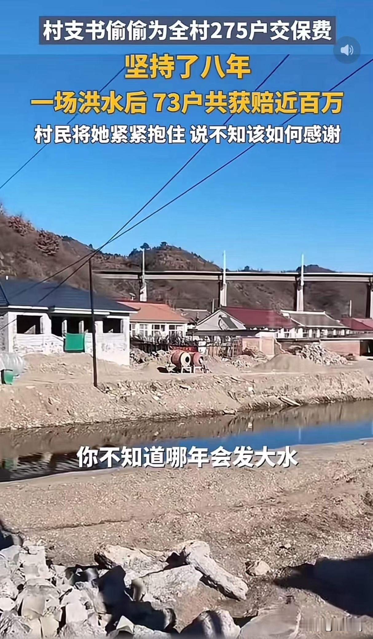 一个藏了八年的秘密!河北滦平马营子村,一场突如其来的大洪水导致村里73户人家的房屋都遭受了不同程度的损失! 村民们满脸愁容,都在想着本来受灾了,还要修建房屋花钱,心情都很不好! 就在大家都在焦虑和无助的时候,村支书马淑云告诉了大家一个藏了8年的秘密! 她说:大家都不要着急,也不要担心,我每年都自己掏钱给咱们全村275户家庭买了房屋保险! 村支书张淑云是一名退休教师,她退休后就来到了马营子乡担任村支书,她看到村子地势很低,又紧邻着河边,她担心发洪水会把村子淹倒,所以就自己掏腰包为每户村民购买了房屋保险! 这一买就是8年!今年由于雨水过大,村里73户人家房子都受到了损害!存竹书的保险可起到了作用!共计赔偿了上百万元! 村民们拿到赔偿款的那一刻,激动得热泪盈眶!攥着村支书张淑云的手不知道说什么好! 太感人了!关键是村支书张淑云自己掏腰包为村民们买保险,如果不是今年发生洪水灾害,她还不说,不知道她还要交多少个8年!好支书,有大爱! 最美村支书