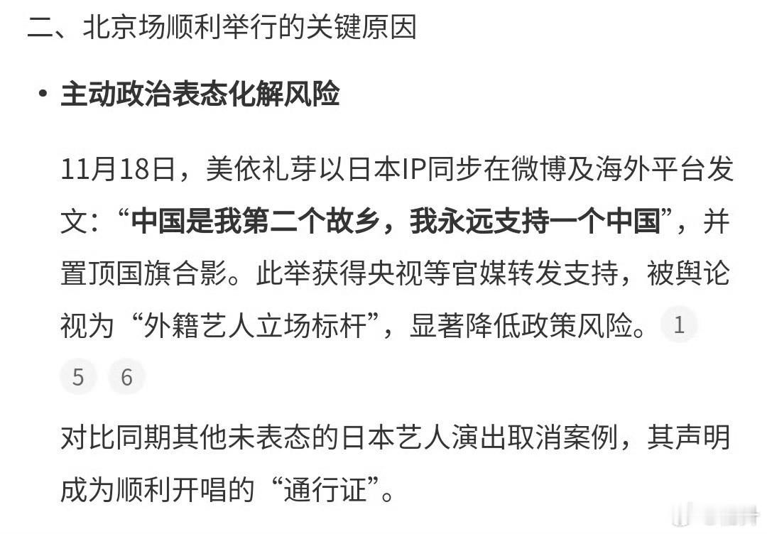 日本歌手上海演唱时被中断演出从北京这边的美依礼芽演唱会的案例来看,对比上海那边滨崎步等演唱会还有中途终止演出的案例,我们能发现,其实整体的处理尺度是有一条准绳的,只不过也确实存在针对特殊情况时基层治理水平跟不上高要求的复杂斗争需要的现象。这种情况下,怎么把代价和压力精确传导到高市早苗当局的身上,需要我们这边全方位的高水平应对…其实如果沟通做到位了,对方不愿意抄正确的作业,那就随他便,该服从斗争需要就得服从,这没什么好说的,如果还存在不听劝反过来自导自演带节奏的话,那更要予以揭露和加倍批判…但如果已经开始进行到一半了,合同的履行和消费者以及组织者的成本已然产生,那么各方有没有办法将相关活动中途塑造成美依礼芽在北京的那种特例?把这种特例的数量增加,是不是比直接突然掐灭要更加于我有利?以后类似的情况还可能会出现,毕竟未来中国和外部的摩擦以及斗争会随着一些重大问题的必然解决而出现,如何把朋友变多,把敌人变少,争取最广大人民群众的支持,是“善于斗争”的重要评判标准。一点拙见,供参考批评…热点观点