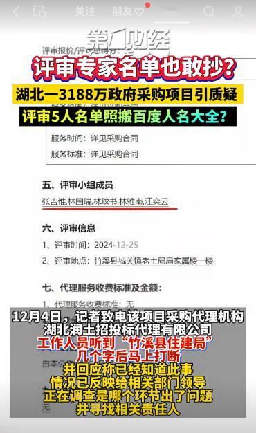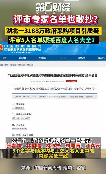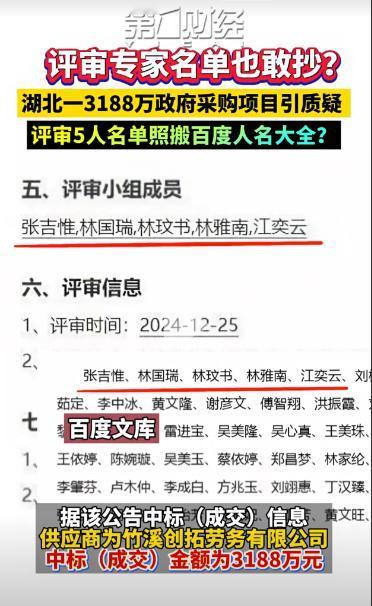 “这是演都不演了?”——湖北十堰,某三千多万项目评审专家五人名单,被指控照抄百度人名大全,当事公司听闻记者询问此事立马挂断电话… 这几个人好忙,又评标,又摆摊,又参加书法大赛,还要参加主持考级,又去研究体育项目…出镜率太高,百度都收入人名大全了。 原来连评标的人名都是虚拟出来的,那中标结果到底怎么出来的,究竟什么人评的?平常什么事都实名制、签名,到这些官方文件正事上,反而不需要了,照搬照抄就OK了,5000年来之少见哦! 这些人造假的时候太懒了,姓氏可以排列组合,重新安上名字嘛!之如:李伟、王明、赵成、孙建之类的,也就糊弄过去嘛!