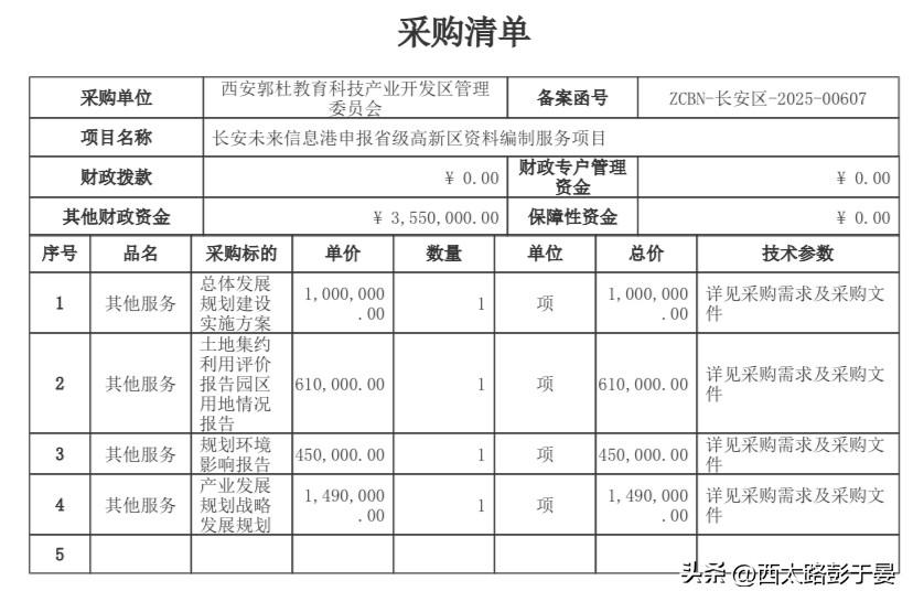 长安未来信息港要冲“省级高新区”!355万招标做申报资料 西安郭杜教育科技产业园有个“长安未来信息港”,最近砸355万公开招标,要做申报省级高新区的全套资料! 这钱具体花在哪儿?100万搞整体发展方案,61万评估土地咋用更合理,45万做环评报告,还有149万专门规划产业方向——这些都是申报省级高新区的“硬材料”,得把园区的发展框架、土地效率、环境影响、产业定位都写清楚,还得通过好几个部门审核才算完。 等这些资料弄好、通过审批,长安未来信息港就能升级成省级高新区,能拿到更多政策和资源支持,以后产业发展、招商引资都会更顺。投标截止到12月10号,看来这园区冲刺“省级”的节奏已经拉满了!
