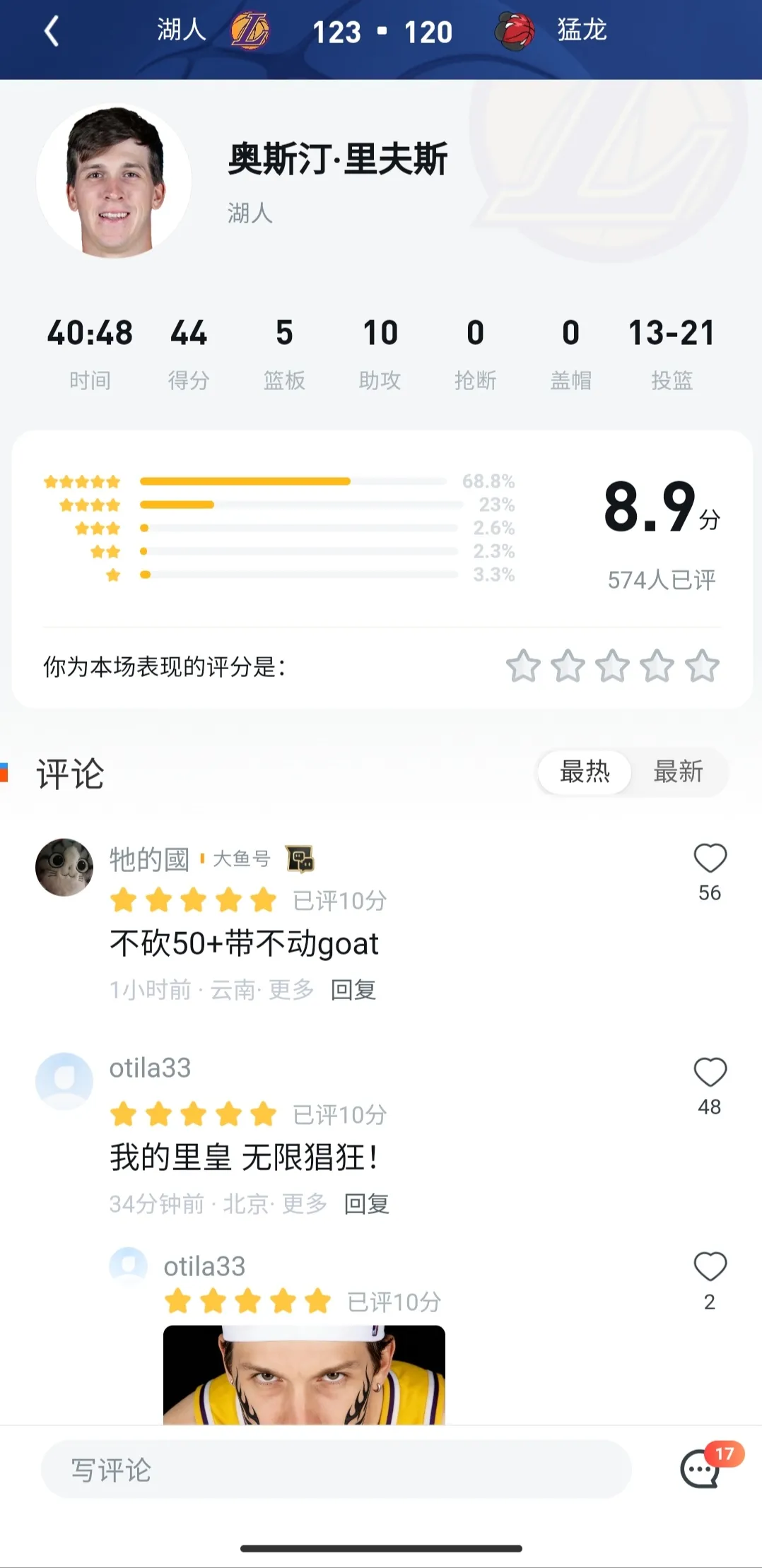 里夫斯:不砍50+带不动goat阿詹,今天请叫我里皇。UC今日球员最高评分当之无愧
