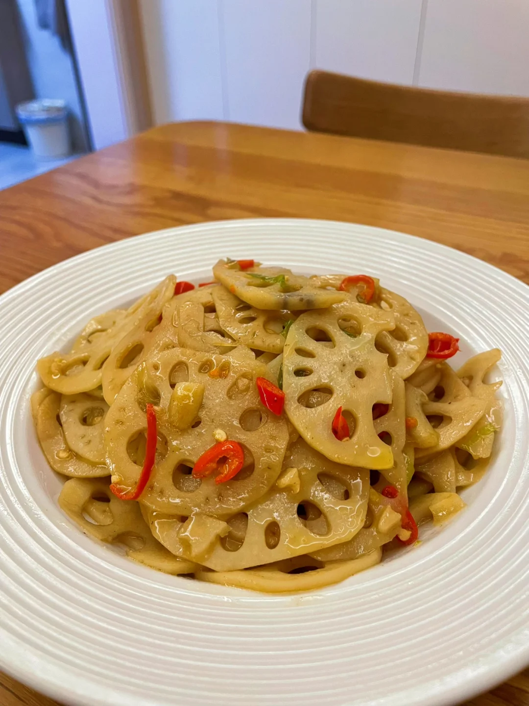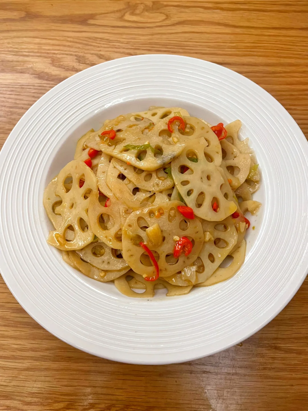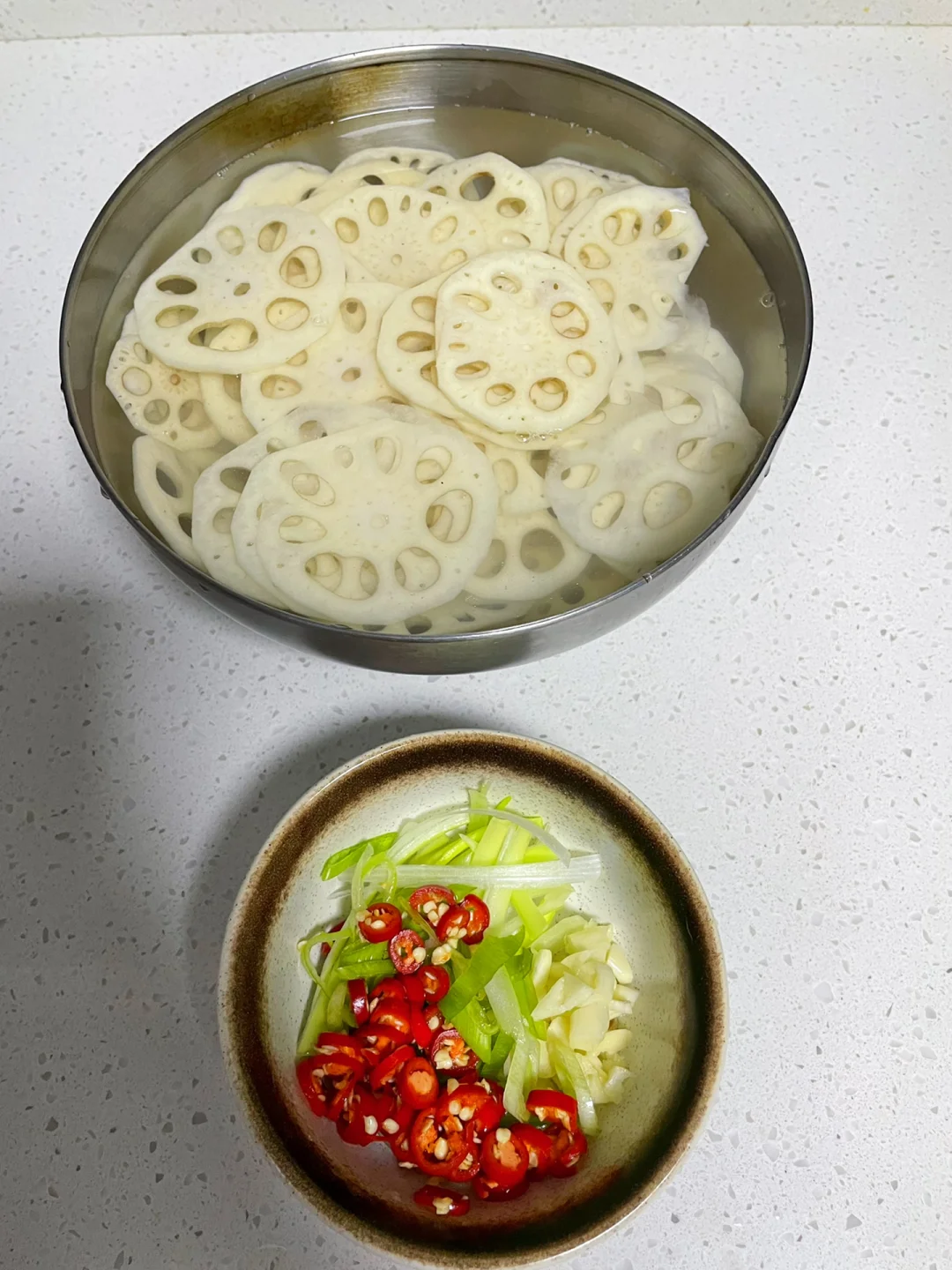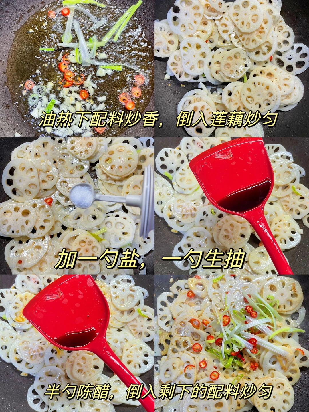 清脆爽口又不会肥的素炒莲藕,好吃又低脂☺️ 🍀🍀🍀食材:莲藕两节,小米辣,葱,蒜 1⃣️:莲藕洗净切薄片,水开下锅加一勺白醋焯水后捞出 2⃣️:锅中少许油,油热下配料炒香,再倒入藕片炒匀,加一勺生抽,一勺盐,半勺陈醋炒匀,再倒入剩下的小米辣和葱炒匀即可