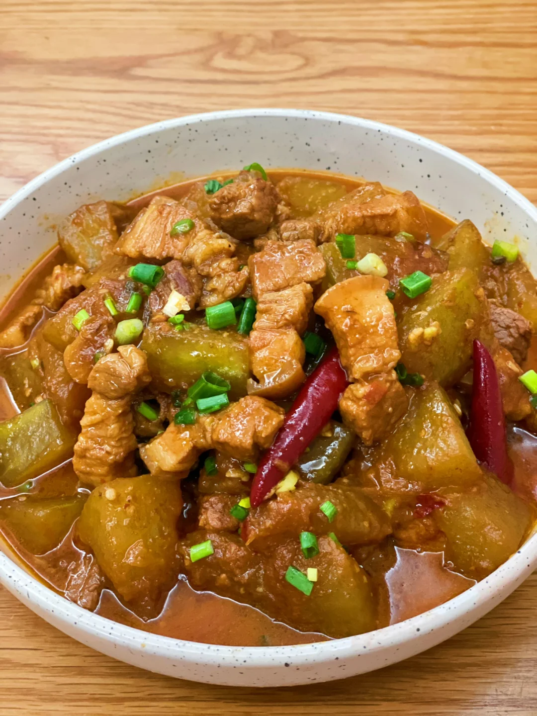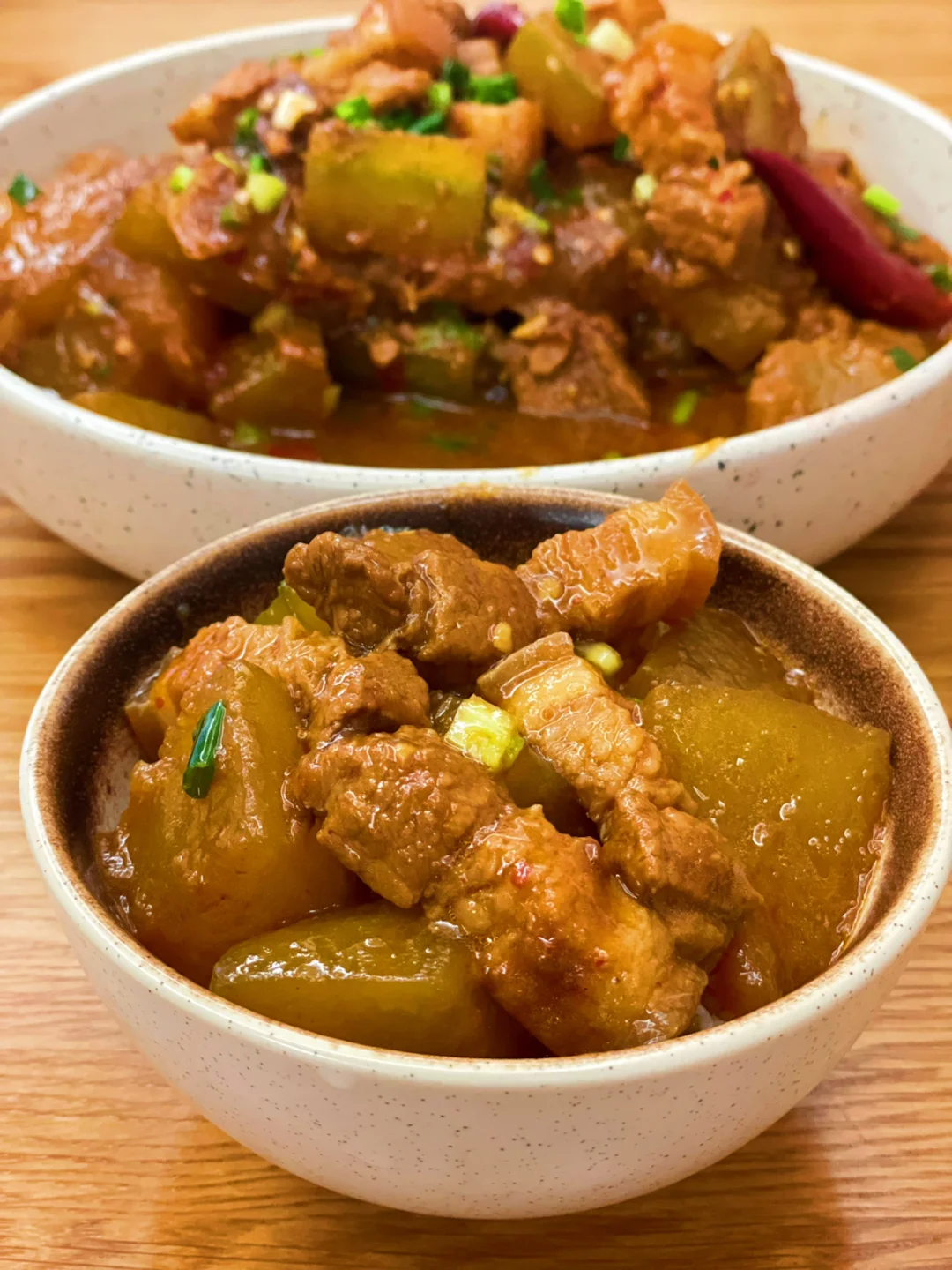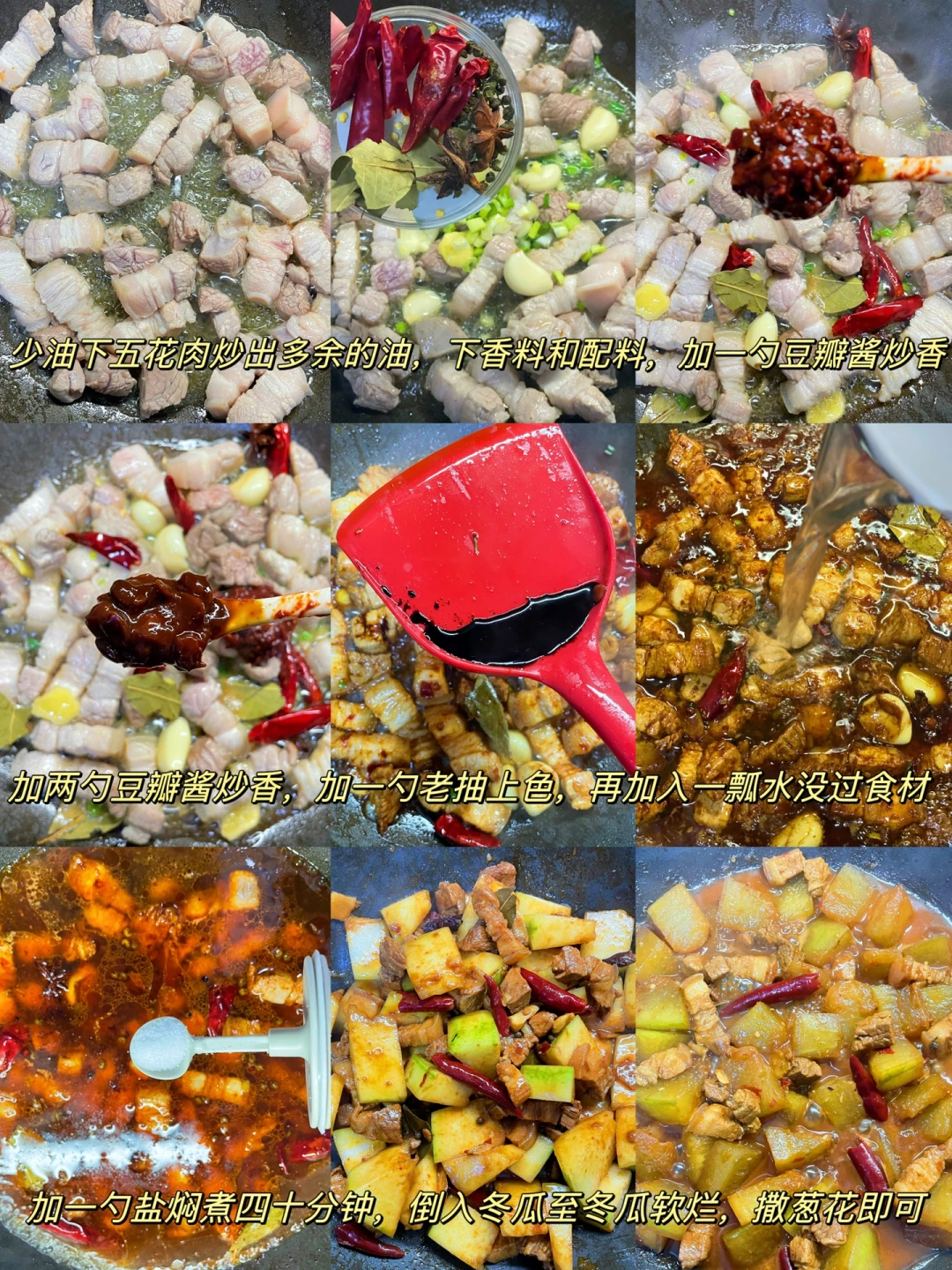 冬瓜除了能炖汤也能炖肉,五花肉和冬瓜的完美结合,堪比红烧肉的天花板,冬瓜和五花肉都软烂入味,吸满了汤汁,也太下饭了🍚🍚🍚 🍀🍀🍀食材:五花肉500克,冬瓜1千克,八角,香叶,花椒,辣椒,葱姜蒜 1⃣️:五花肉切小块,冬瓜切小块备用,大蒜拍碎,姜切片, 2⃣️:锅中少油,倒入五花肉炒出多余的油,加入香料和配料炒香,再加入一大勺豆瓣酱和两勺黄豆酱炒香,加入一勺老抽上色,倒入一大瓢温水加一勺盐大火焖煮四十分钟再倒入冬瓜炒匀,继续焖煮大概十五分钟,直至冬瓜软烂,撒上葱花即可