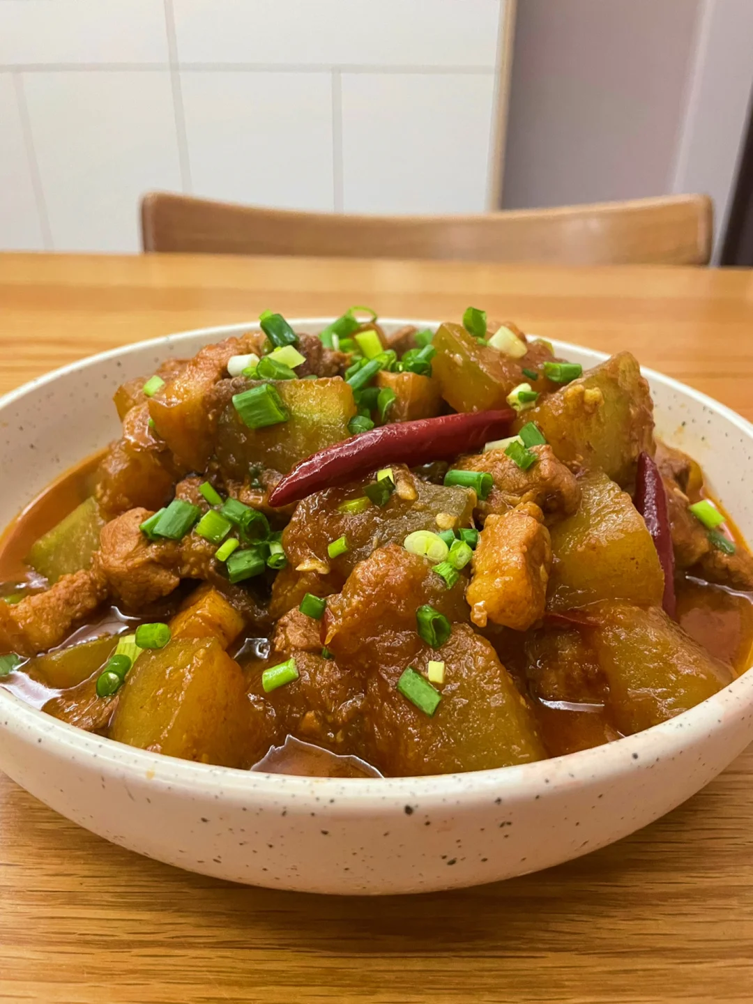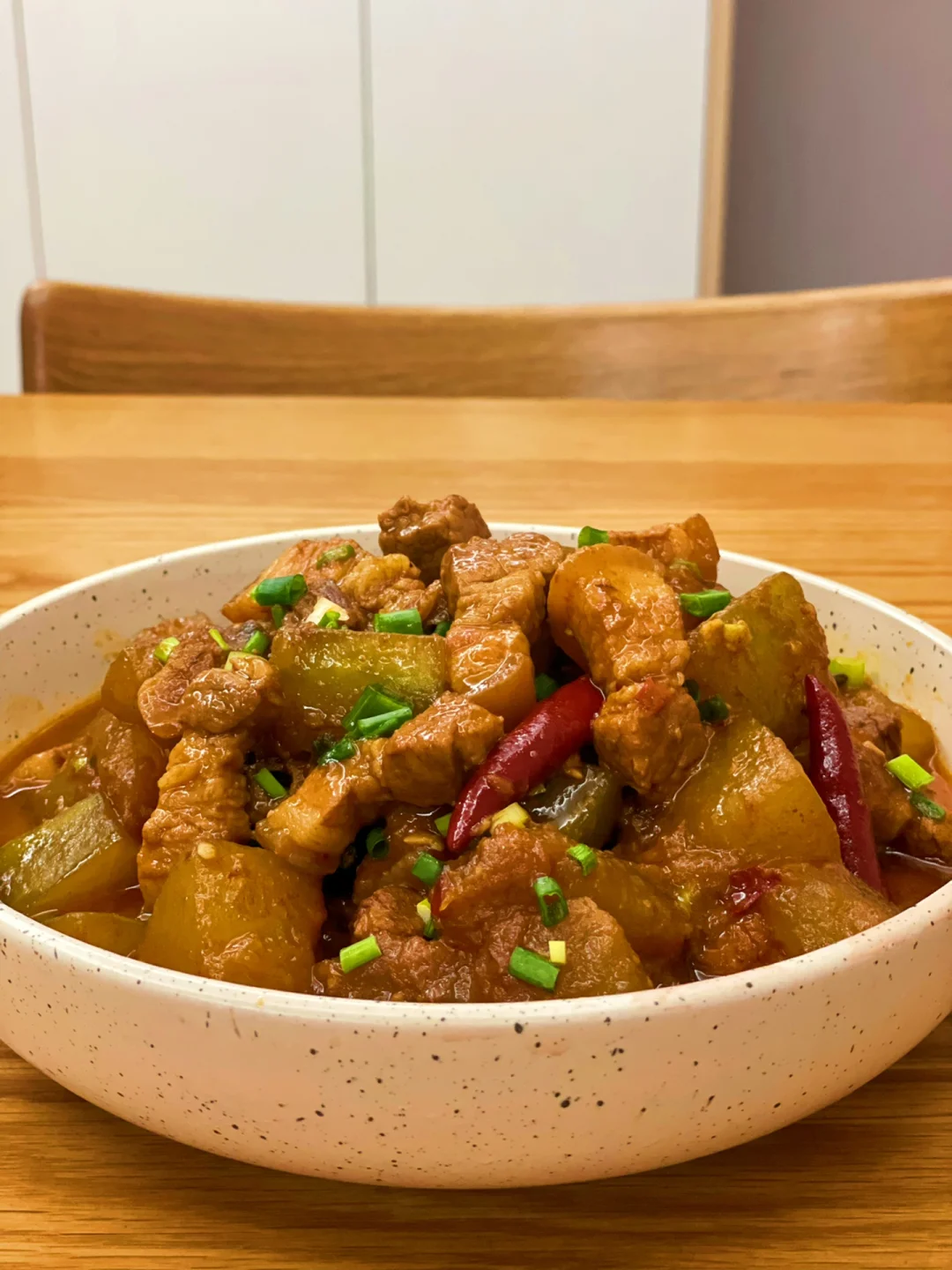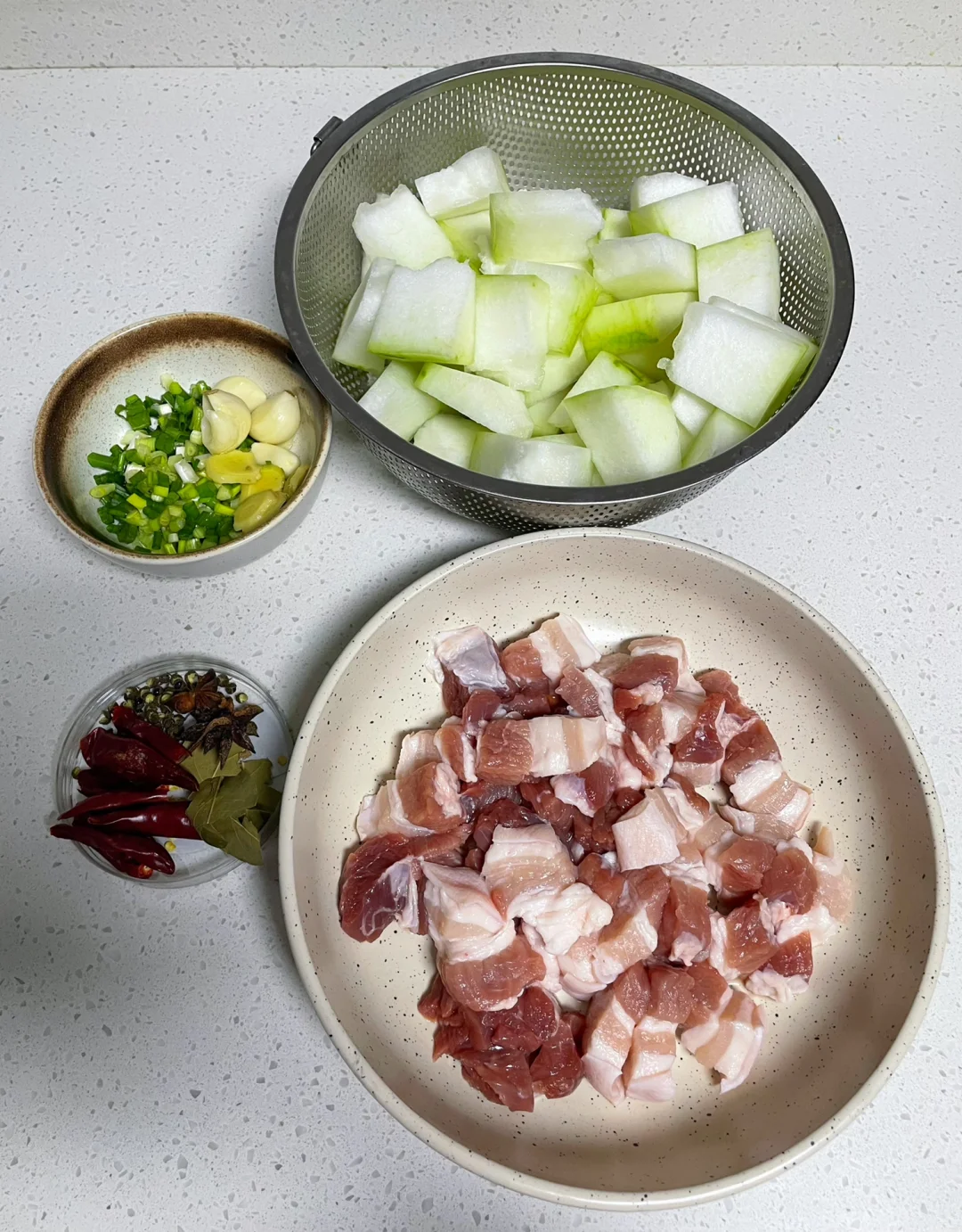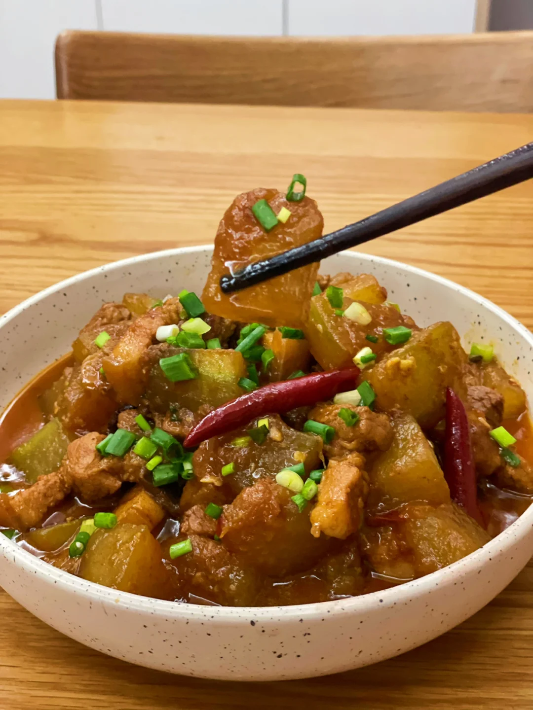 冬瓜除了能炖汤也能炖肉,五花肉和冬瓜的完美结合,堪比红烧肉的天花板,冬瓜和五花肉都软烂入味,吸满了汤汁,也太下饭了🍚🍚🍚 🍀🍀🍀食材:五花肉500克,冬瓜1千克,八角,香叶,花椒,辣椒,葱姜蒜 1⃣️:五花肉切小块,冬瓜切小块备用,大蒜拍碎,姜切片, 2⃣️:锅中少油,倒入五花肉炒出多余的油,加入香料和配料炒香,再加入一大勺豆瓣酱和两勺黄豆酱炒香,加入一勺老抽上色,倒入一大瓢温水加一勺盐大火焖煮四十分钟再倒入冬瓜炒匀,继续焖煮大概十五分钟,直至冬瓜软烂,撒上葱花即可