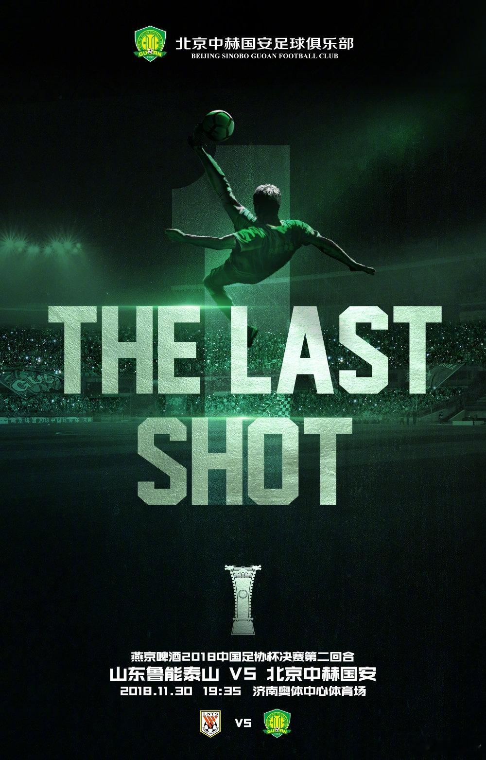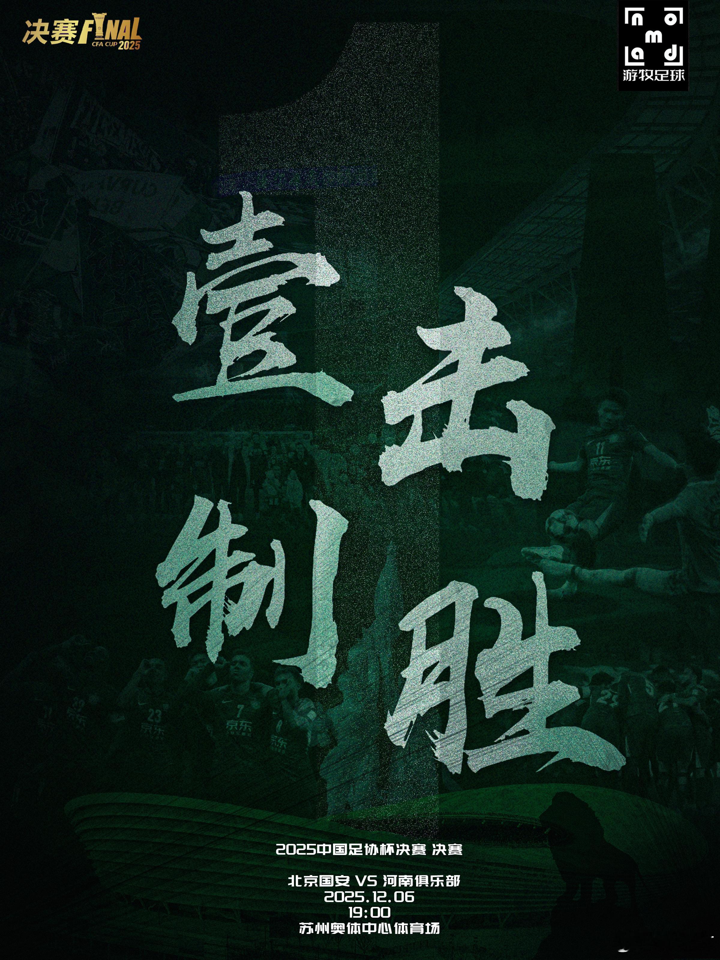 足协杯决赛 💚赛前海报|一击制胜👊海报向2018年11月30日足协杯决赛的海报(图二)致敬,采用绿色银色镜面反射等方式呈现文字 ,背景沿用了“1”字传统,是争第一的精神延续,同时展现夺冠的渴望。上次足协杯的海报叫The last shot 《最后一击》 ,这次是《一击制胜》。海报作者我觉得,对河南这种打法的球队,很难踢的很开放,真的需要有人“一击制胜”。北京国安