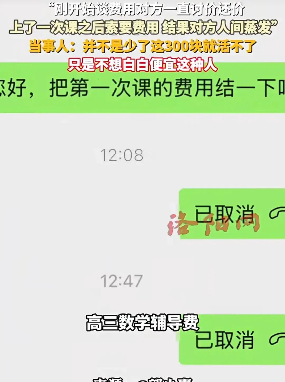 清华学霸被白嫖!补课费300块都赖账,家长这波操作太离谱了... 沈阳某高三家长为了省补课费,硬是把课时费从500砍到300。结果孩子上完课,转头就把清华补课老师拉黑。现在的大学生都这么难了吗? 更绝的是,这位家长还理直气壮:"大学生又不差这点钱"。被逼急的学霸直接报警,在朋友圈怒挂聊天记录。评论区瞬间炸锅,有人算过账:300块还不够买套真题卷的。 最讽刺的是什么?补的还是数学课。不知道这位家长有没有算过,失信的成本可比补课费贵多了。话说回来,要是你家孩子知道爸妈这么干,这课是不是白补了?