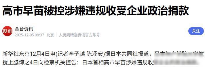 下台已成定局?高市没想到,还没撤回谬论,日本检察机关收到控告 高市早苗最近遇到麻烦,她在2024年底到2025年12月初这段时间被曝光两件事,一是她管理的政治资金团体违规收下1000万日元,二是她在竞选自民党总裁期间私下花费3300万日元用于网络宣传,这笔开销比对手石破茂的支出高出200倍,事情公开后大家都看出她的做法有点过头。 她上台后任命了七个有黑钱前科的人进入内阁,民众对此感到不满,超过七成的人认为她的用人方式很混乱,执政联盟中的维新会直接表示要退出合作,岸田政府对此保持沉默,导致政府运作面临瓦解风险,这个仅靠少数票支持的班子难以有效开展工作。 她在十一月公开说台湾有事就是日本有事,搬出《旧金山和约》当作理由,可中国根本没签署这份条约,法政大学的教授指出她理解错了概念,中方迅速做出回应,暂停青少年交流项目,收紧稀土出口,日本旅游业损失达到两万亿日元,汽车和电子企业纷纷抱怨经营困难,不少公司直接批评政客不应拿外交关系冒险来换取选票。 东京大阪这些地方开始有人上街表达不满,他们举着标语,上面写着不要战争要生活,十一月的调查显示超过一半的人认为政府应该先解决物价和房子问题,而不是天天喊着扩军,大家对国家安全这一套说法已经听烦了,右翼鼓吹的正常国家化支持率也跌到了十年来的最低点。 其实这件事不单是她一个人的问题,从安倍时期就有的“黑金”传统一直没彻底解决,政治献金改革提过好几次,每次都被拖延过去,日本没有像德国或者韩国那样追究个人责任的法律,网上水军操控舆论也无人管理,技术虽然进步了,规矩却还是老样子。 她原本打算用台海紧张这件事,转移大家对物价和养老金问题的不满,可老百姓并不接受这个做法,大家把安全当作借口,其实只是想要饭碗能稳当点,这种手法在十年前钓鱼岛国有化的时候已经用过一回,现在中日经济紧紧绑在一起,规模超过四千亿美元,谁都承受不起损失,商界人士私下都在抱怨,说有些政客只顾着煽风点火,根本不考虑供应链会不会断掉。 对比韩国的情况,尹锡悦因为对华强硬而吃亏,但韩国人可以通过法院弹劾来制衡政府,日本这边没有这种机制,民意只能依靠游行和投票表达,制度跟不上变化,我觉得,这种靠情绪拉票、靠外部制造对手的方式,迟早会让自己陷入困境,政治不是演戏,观众也不傻。