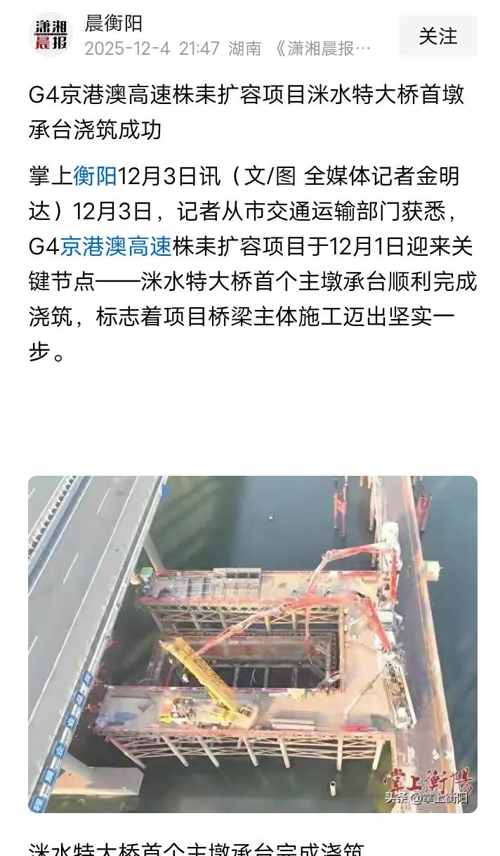 好消息,G4京港澳高速株洲朱亭至衡阳耒阳段4改8扩容工程洣水特大桥首个主墩承台成