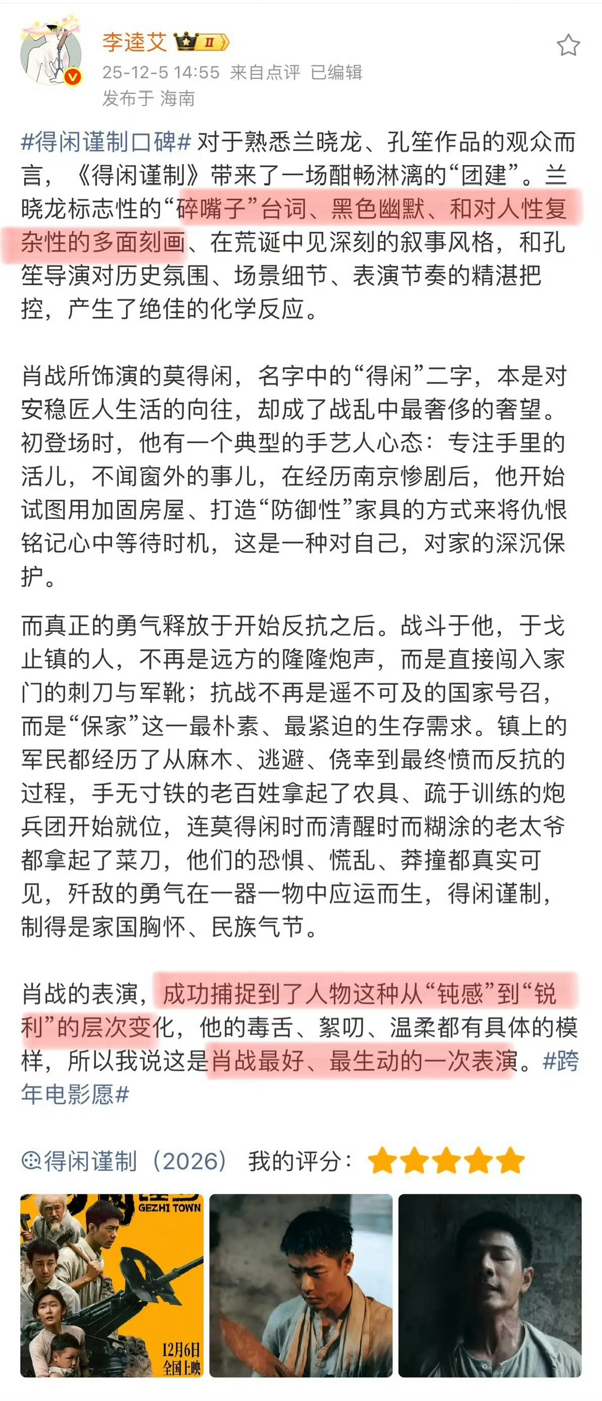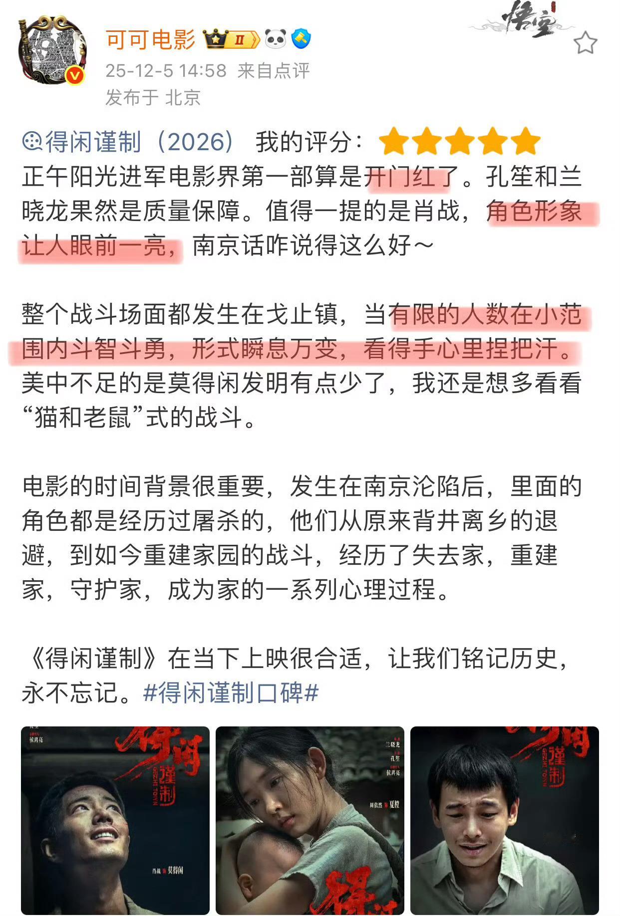 《得闲谨制》看片反馈好评不断!肖战的莫得闲和百姓们从麻木到反抗,小人物的家国守护,是鲁迅式群像的绝地反击,更是藏在烟火里的民族气节戈止镇的平凡人,在南京沦陷后的绝境里,把“保家”刻进骨血,《得闲谨制》用小人物的反抗,讲透家国大义。孔笙+兰晓龙的金牌组合,肖战演绎从“钝感”到“锐利”的莫得闲,《得闲谨制》让平凡人的反抗有了最动人的模样。用得闲谨制打开年末现实娱乐