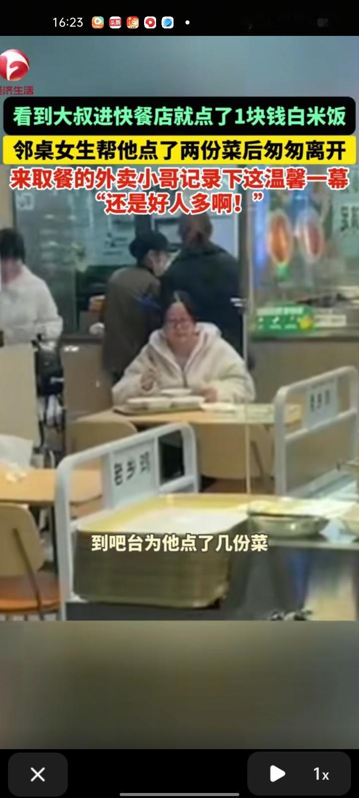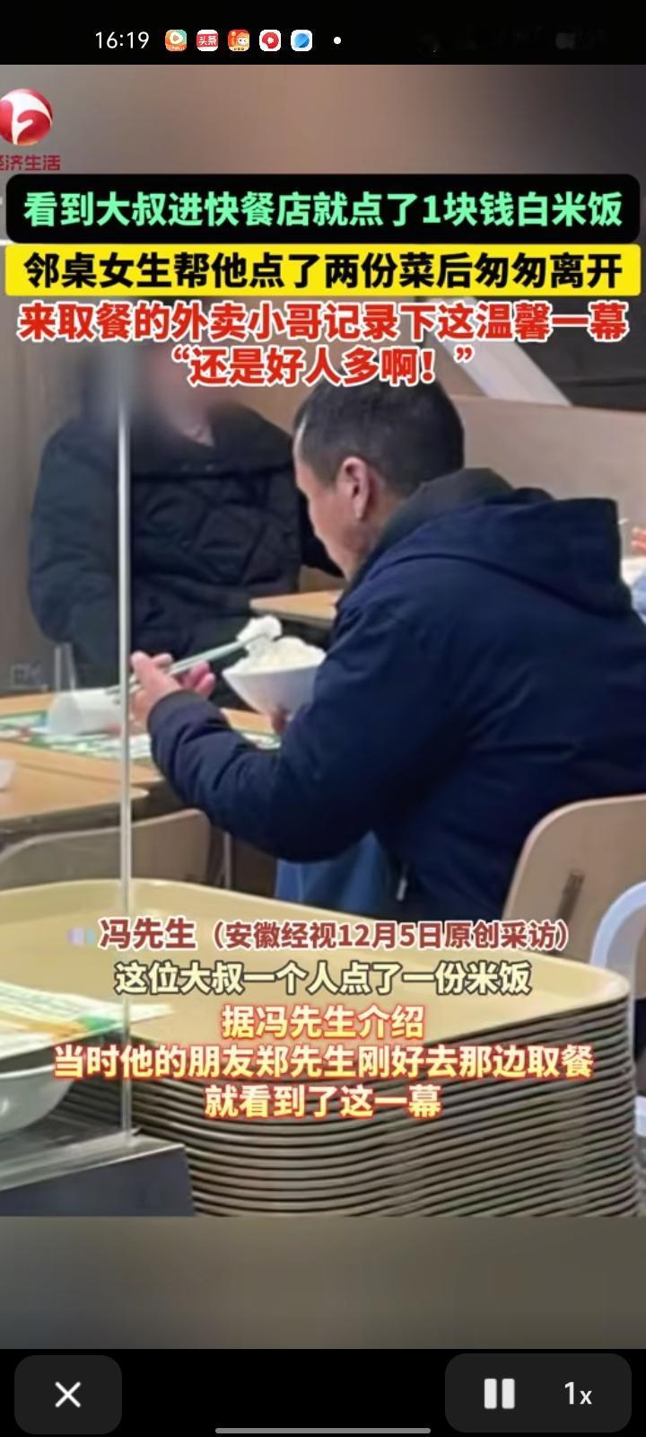 12月4日,安徽六安。网友晒视频称,自己和朋友在老乡鸡快餐店取餐时,看见一位大叔只点了一块钱的白米饭,任何菜都没点。邻桌女生看不下去,就去吧台为他点几份菜送给大叔吃,然后就离开了。这一幕很温暖也很温馨,直言“六安还是好人多”。