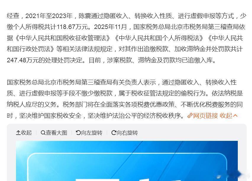 难道被封禁的原因,就是偷税逃税吗?看数额,少缴纳税款118.67万元,绝对不是近年来偷税漏税最多的一个公众人物了,比他偷税多的人可多了去了,可见这并不是陈震被封禁的关键原因。但他在前几年可是言之凿凿的说过“逃税最可耻”的话,现在又自己打脸,只能说吃设定这一块,回旋镖迟早要正中自己的眉心。那么,他被封到底是咋回事儿呢?陈震偷税案陈震偷税追缴并罚共计247.48万元