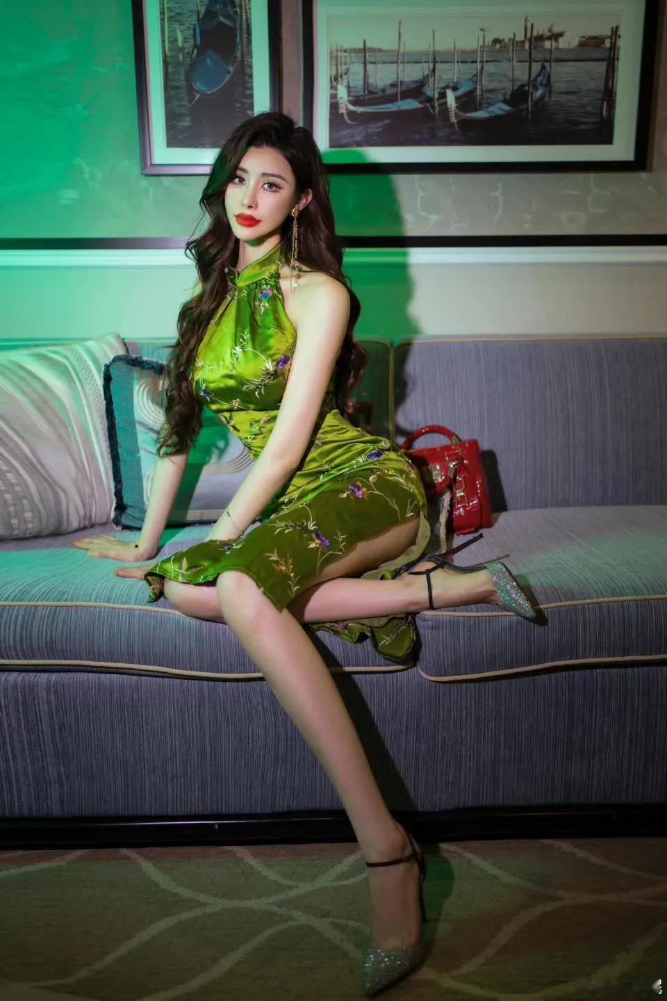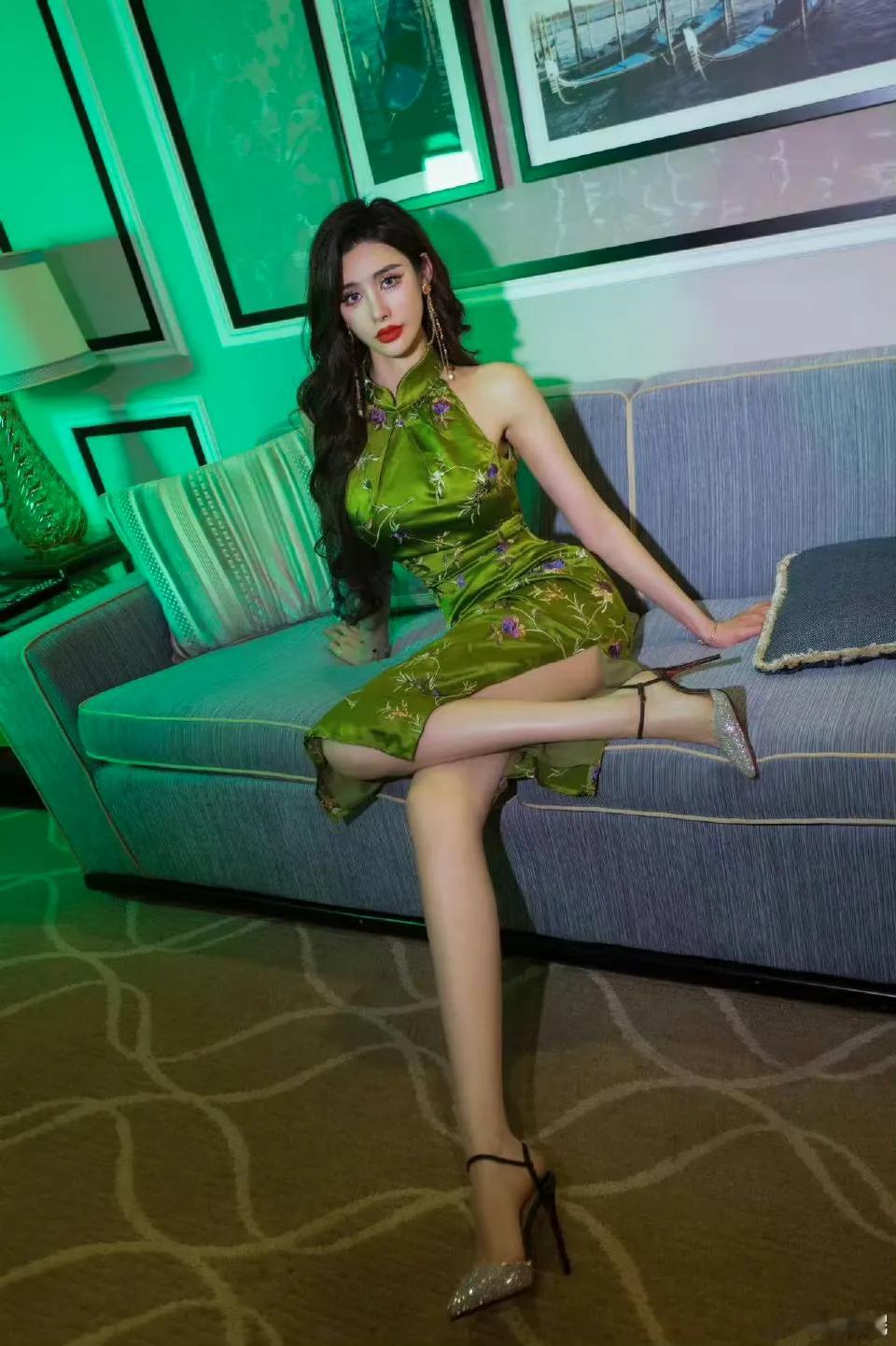 陈欣馜,绿意美人优雅绿衣美人,坐在沙发上,尽显高贵气质。💃👗👠