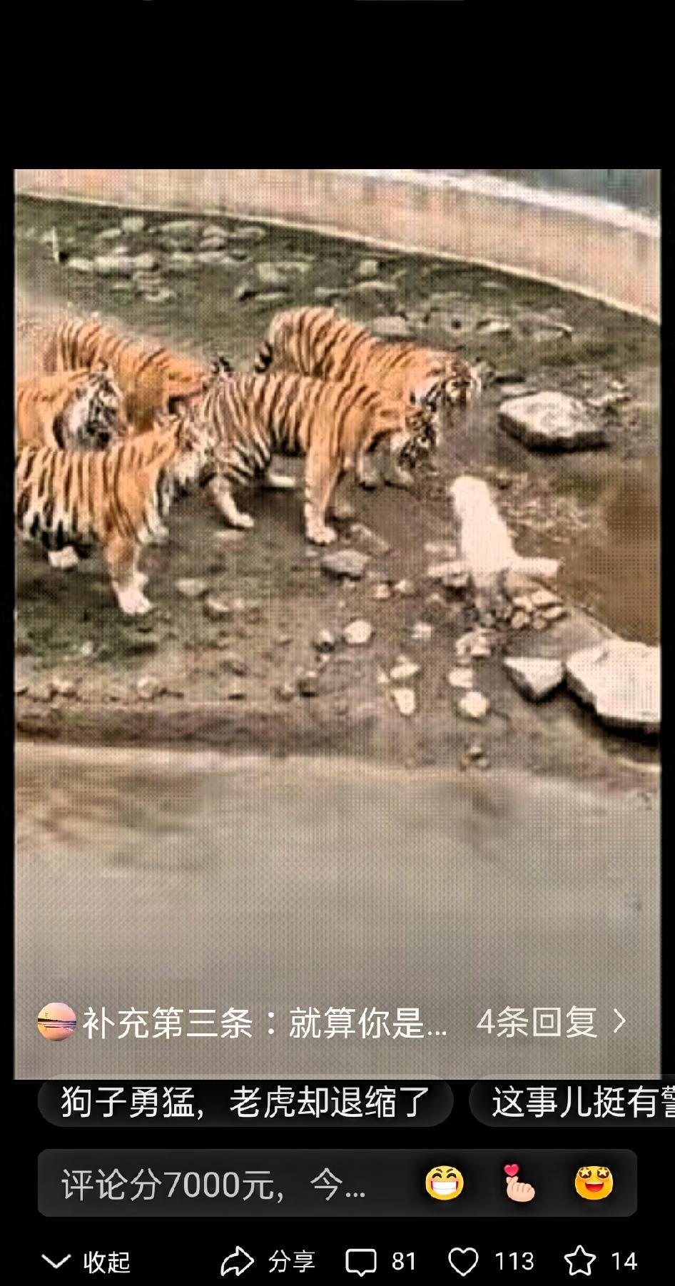 一群人在动物园围栏外观看老虎,突然间,一男子把一只狗子推了下去。 周围人都没反应过来,狗子已经掉进了围栏内。 大家当时都替狗子担心,觉得老虎毕竟是“森林之王”,狗子肯定凶多吉少。可实际情况却出乎意料,狗子掉下去后没有害怕,反而朝着老虎的方向走过去,而那几只老虎,不仅没主动攻击,还往后退了几步,显得有些退缩。 这并不是说狗子有多厉害,也不是老虎天生胆小。主要是这些动物园里的老虎,长期被圈养着,每天定时有人投喂食物,不用自己去捕猎,也不用为了生存和其他动物争斗,慢慢就失去了野外老虎的野性,身上的“虎威”也淡了很多。 它们面对突然冲过来的狗子,第一反应是谨慎和避让,而不是攻击。 最让人反感的是推狗的那个男子。他这样做,不管是出于好奇还是好玩,都是对生命的不尊重,也违反了动物园的规定。 幸好这些老虎没有强烈的攻击性,要是换成野外的老虎,狗子恐怕就危险了。他只图自己一时的痛快,完全没考虑狗子的安全,也没顾及可能引发的危险。 这件事其实能说明两个问题:一是长期处于安逸环境中,即使是原本很厉害的角色,也可能慢慢失去自己的优势;二是做人不能太自私,不能为了自己的一时兴起,就做出伤害别人或动物的事。 不管对人还是动物,都该有基本的敬畏心,遵守公共规则。