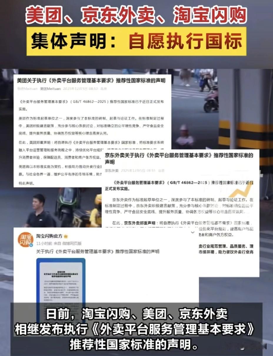 外卖三国杀按下暂停键! 美团京东淘宝齐喊“自愿”,这水有多深? 外卖圈发生了一件怪事 美团、京东外卖、淘宝闪购 三大平台突然齐发声明 口径高度一致: “自愿执行”一项新的国家标准 场面堪称“乖巧” 但事情真这么简单吗? 这背后是一场触及根本的行业地震 1️⃣ 第一层:何为“自愿”? 这份标准并非强制 平台却抢着表态 核心原因就一条: ✅美团和淘宝 ✅正是这份国标的起草者 自己定的规则 当然要带头“自愿” 2️⃣ 第二层:监管的“软刀子” 这不是普通声明 而是一次高规格的合规宣誓 标志着监管思路巨变: ⚠️从前是事后罚款“硬监管” ⚠️现在是定好标准“软治理” 平台必须把食品安全、骑手权益、算法公正 作为新的核心KPI 3️⃣ 第三层:行业的生死线 这份标准 就是未来外卖行业的游戏规则 它意味着: ❌靠“二选一”垄断商户的路,断了 ❌靠算法无限压榨骑手的路,堵了 ❌对“幽灵厨房”睁只眼闭只眼,不行了 竞争从烧钱抢市场 彻底转向拼服务、拼责任、拼生态 这意味着什么? 对你我普通消费者 外卖可能不会更便宜 但必须更安全、更规范、更有保障 每一次送达 都应有迹可循、有责可担 对百万外卖骑手 “最严算法”有望戴上“紧箍咒” 报酬与保障 有了国家标准的撑腰 这场“自愿”行动 实为一场行业大洗牌的前奏 一切旧模式 都在为高质量发展让路 你最期待外卖服务在哪个方面立刻改善? 是食品安全可追溯? 骑手权益保障? 还是杜绝大数据杀熟? 点赞关注行业新规; 关注见证服务升级; 评论说出你的心声! 淘宝闪购外卖 京东外卖规则