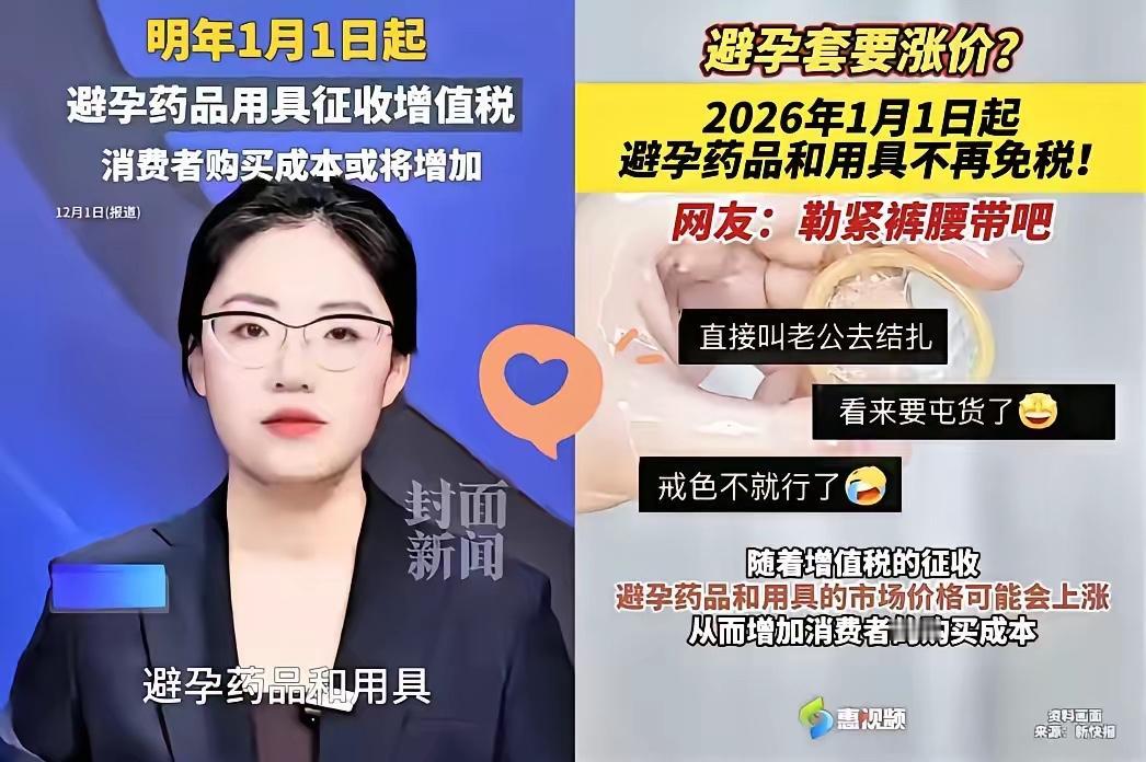 国家又出政策 这次你是生还是不生 2026年1月1日起取消避孕用品32年免税政策,婚介服务反倒免税,这信号也太明显了。 还没准备好当父母?那你得多掂量一下钱包了。 这不是简单的税收调整,而是一记明晃晃的“政策方向灯”:少生优生的时代落幕,鼓励生育的信号全面亮起。 你们知道吗?这避孕用品免税政策可不是凭空来的,1994年税制改革时跟着计划生育国策一起落地,一实行就是32年。那会儿国家要控制人口增长,免税能让避孕套、避孕药这些东西卖得便宜,大家避孕成本低,也能更好配合政策,现在时代变了,政策自然跟着掉头。 说涨价其实也没那么夸张,15块钱的普通避孕套征税后也就多花1块多,30块的紧急避孕药涨幅顶多3块,整体也就5%-10%的浮动。但这背后的心思太好猜了,国家就是想通过税收杠杆,悄悄调整大家的消费倾向,毕竟现在人口形势真的不乐观。 2024年咱们国家出生人口比死亡人口少了一百多万,自然增长率第一次变负,60岁以上老人都快3亿了,老龄化压力越来越大。劳动力以后会越来越紧张,养老金、医疗资源都会跟着承压,鼓励生育已经不是选择题,而是必须做的事。 婚介服务同步免税特别耐人寻味,现在年轻人婚恋成本多高啊,一场相亲介绍费动辄上千,免税后商家说不定会降价,就是想让大家更容易找到对象、走进婚姻。毕竟没有婚姻做基础,生育自然无从谈起,这政策是从源头开始发力。 但说句实在的,年轻人不敢生,真不是因为避孕用品贵那几块钱。养个孩子从出生到大学毕业,平均要花几十万,奶粉、早教、学区房、补习班哪样不花钱?托育机构要么少要么贵,老人帮不上忙的话,夫妻一人辞职带娃,家庭收入直接少一半。 这些年国家也在补短板,有的地方三孩家庭一年能领1万块补贴,托育服务也在慢慢扩容,但跟实际养育成本比起来,还是显得不够。避孕用品征税更像是个强烈的信号,提醒大家国家在全力推动生育,可真正要让年轻人敢生,还得解决后顾之忧。 身边不少朋友都在吐槽,不是不想生,是生不起、养不起。房价没降、教育支出没减、职场对宝妈的歧视还在,这些核心问题不解决,再怎么调整税收,大家还是会犹豫。政策的心意是好的,但得落到年轻人真正的痛点上才行。 各位读者你们怎么看?欢迎在评论区讨论。