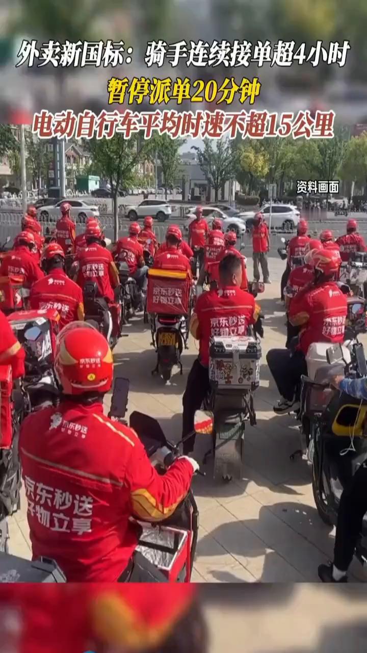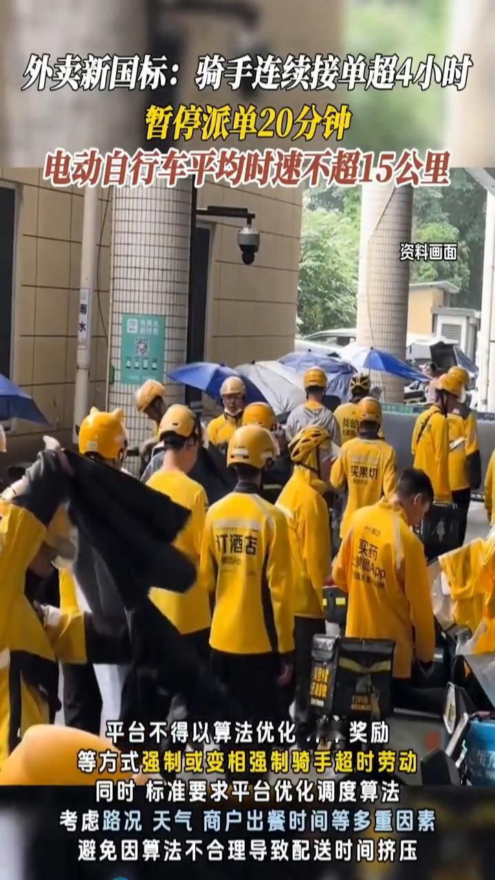 外卖新国标:骑手连续接单超4小时,暂停派单20分钟,电动自行车平均时速不超15公里。 近日市场监管总局发布推荐性国家标准,新国标对配送员工作时间作出明确限制,每天接单时长原则上不超过8小时,达到8小时后需经骑手确认方可继续接单。连续接单超4小时应发出疲劳提示,并暂停派单20分钟。平台不得以算法优化、冲单奖励等方式强制或变相强制骑手超时劳动。 同时标准要求平台优化调度算法,考虑路况、天气、商户出餐时间等多重因素,避免因算法不合理导致配送时间挤压。商户出餐超时系统应对订单进行补时,并允许骑手免费转单或无责取消。配送时长计算需符合安全时速,电动自行车平均时速不得超过15公里。