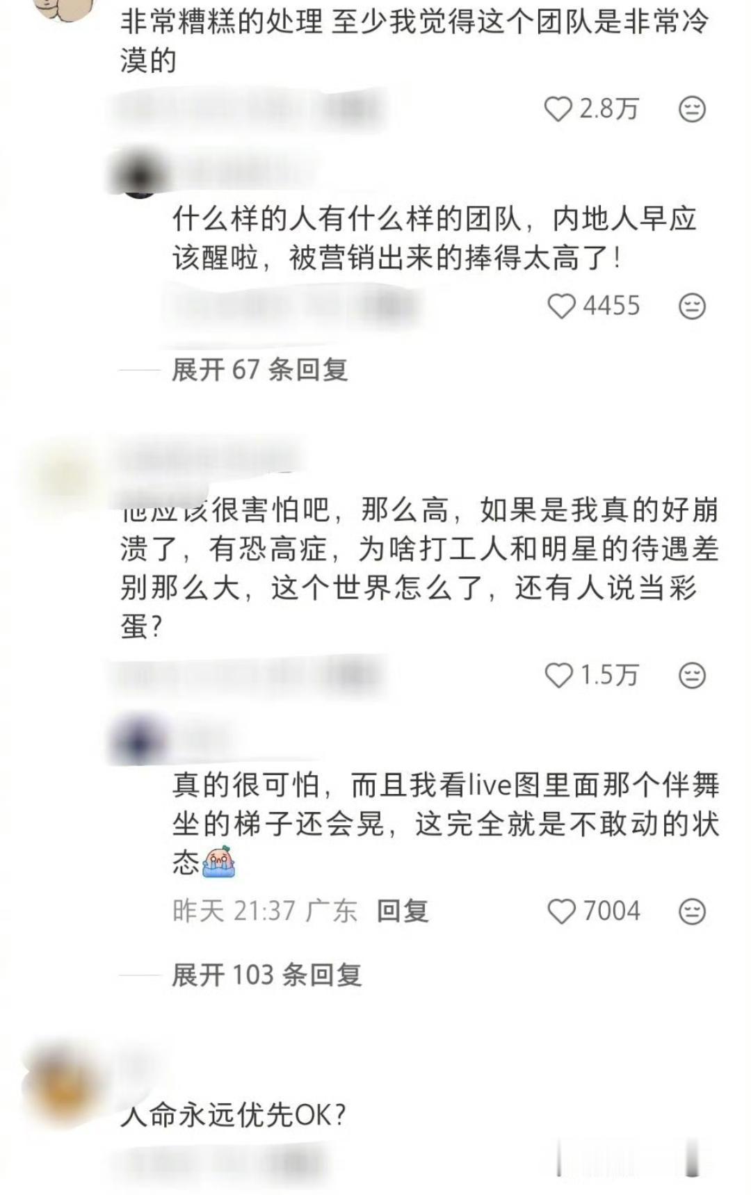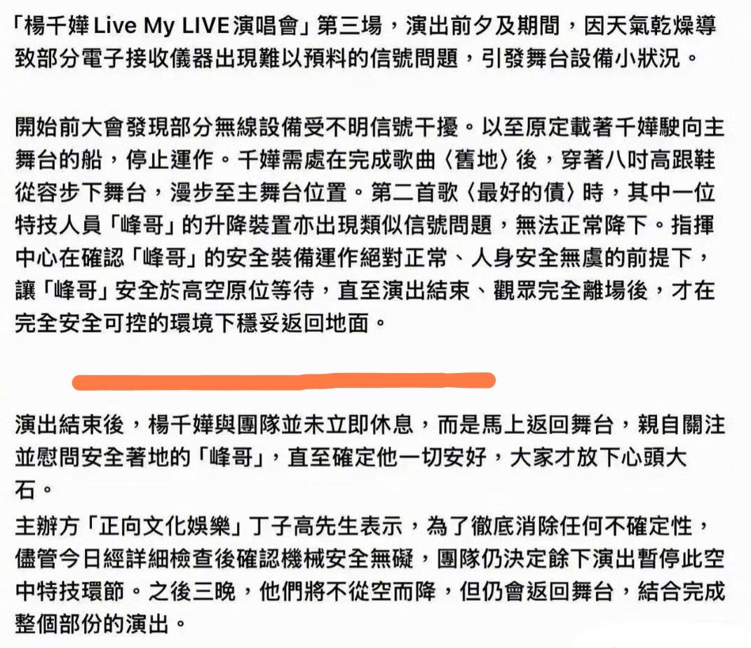 太抽象了,杨千嬅演唱会的伴舞小哥因为威亚坏了,结果被吊在钢架上面几个小时。 整个演唱会就在上面待着。 虽然说指挥中心确认舞伴的安全装置正常,人身没有什么大的危险。 但是平心而论,那个架子本身其实好像也不怎么结实。 退一万步说,就算架子结实,也不应该把人放在上面吧? 之前就闹出过演唱会现场东西掉下来,把人家舞伴砸坏了的事情。 这次就闹出这样的事情。 虽然明星的生命是命,但是普通人的命也不是这么不值钱吧?