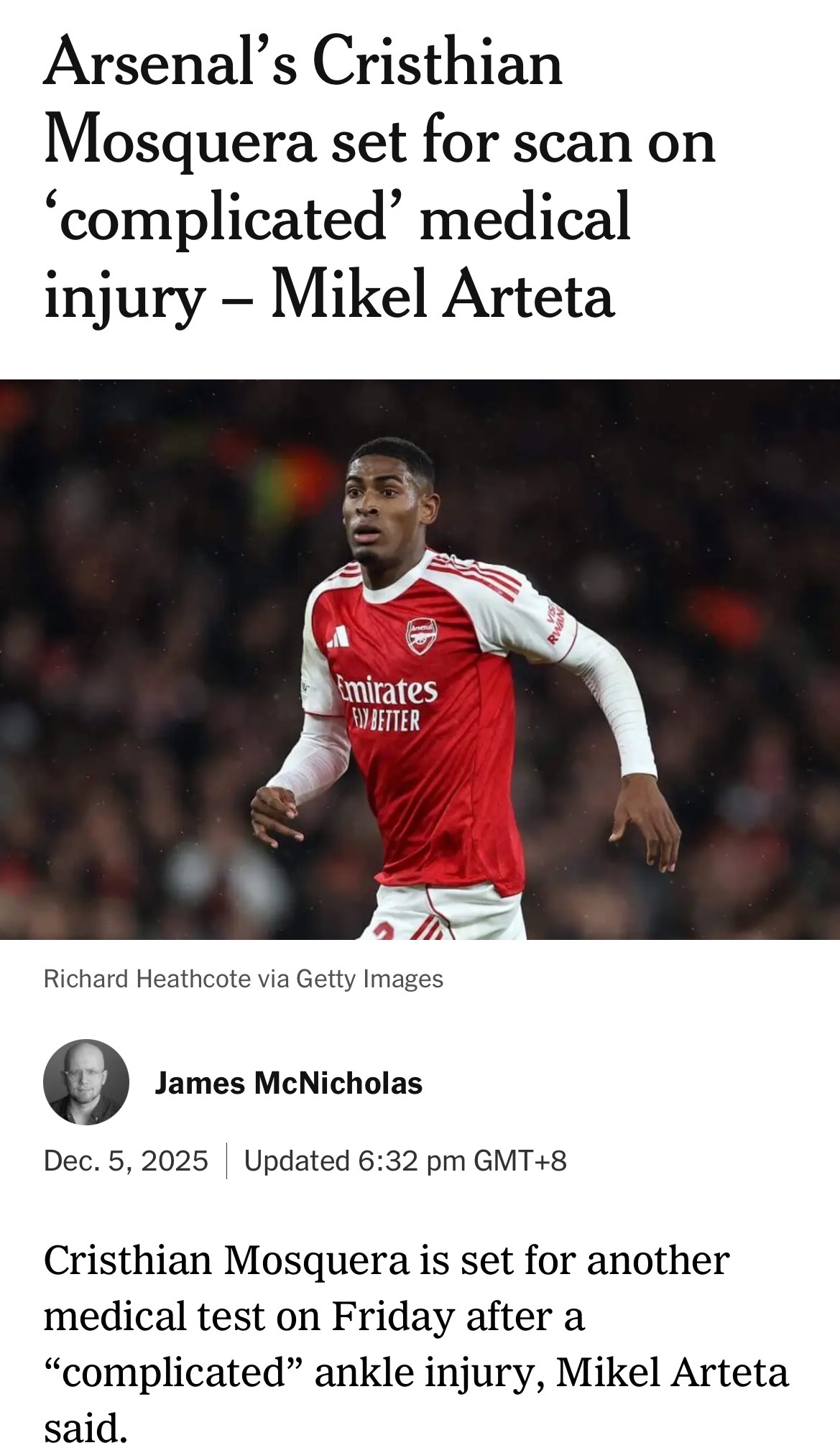 阿尔特塔表示,莫斯克拉在遭遇“复杂”的脚踝伤势后,将于周五接受另一项医疗检查。