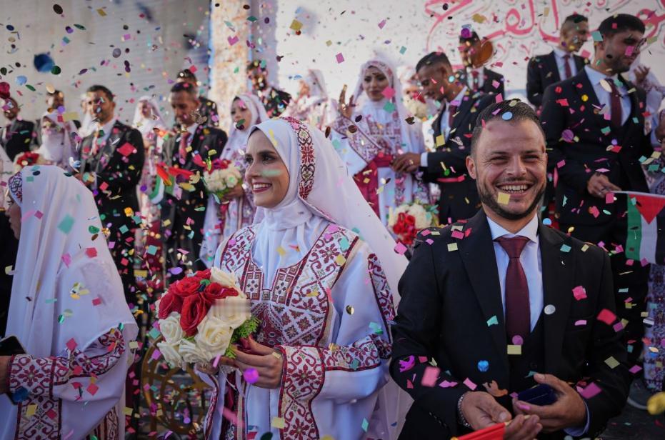 废墟上的红地毯!加沙54对新人集体婚礼,战火中绽放希望 “残垣断壁遮不住,爱与希望破尘生”!12月2日,加沙南部汗尤尼斯的废墟广场上,54对新人踏着红地毯举办集体婚礼。新娘身着巴勒斯坦传统刺绣长袍,手捧国旗色花束,新郎挥舞小国旗,喜庆鼓声在半毁建筑间回荡。 这场“欢乐之袍”婚礼由阿联酋人道组织主办,依托10月生效的巴以停火协议促成。新郎穆赛义德坦言,在战乱、饥饿与失去之后,这场婚礼让人们感受到“心脏仍在跳动”,彰显加沙人民从废墟中崛起的决心。
