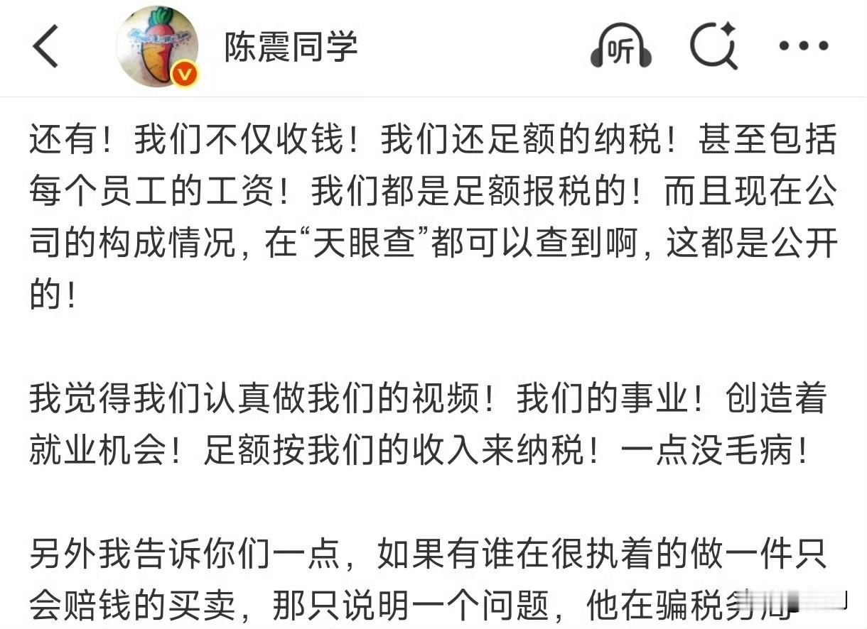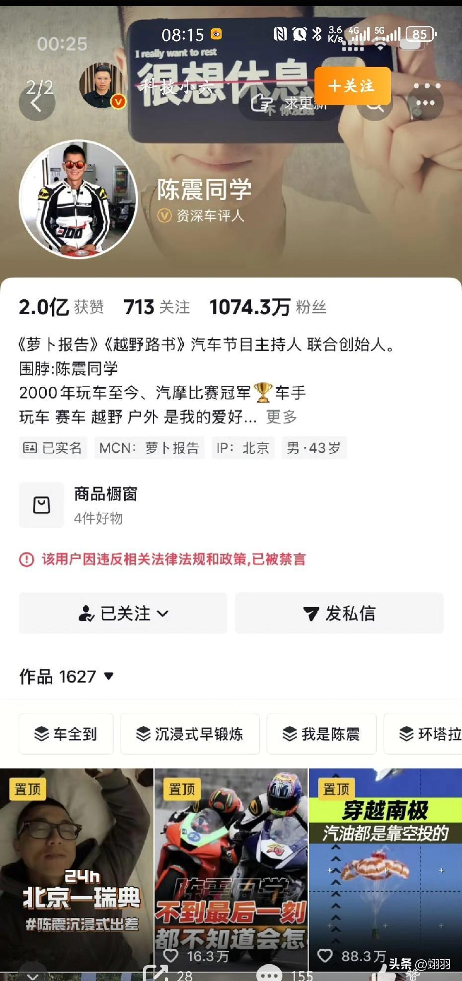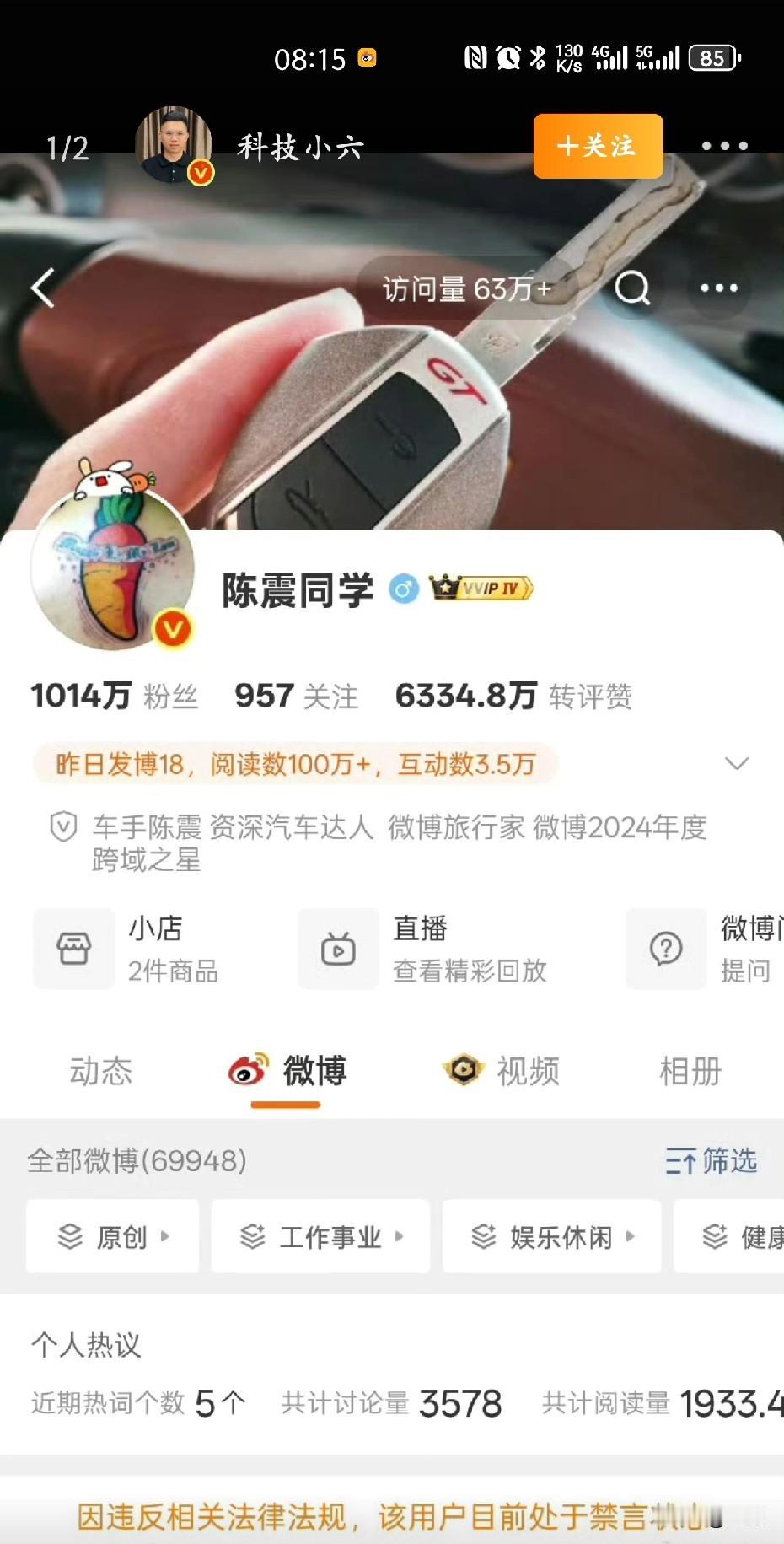 没人能料到 陈震这样几千万粉丝的大V 突然被禁言 原因竟是偷税漏税 起初 大家以为是他不够低调 恶意评论小米 还有其他不低调的言语 被人举报才遭禁言 可很多人没猜到 他竟是因偷税漏税被封 几个月前 陈震还在说依法纳税 可还是出了这事 只能说明 他虽真挣到钱了 却还嫌挣得少 他以为无人举报、无人知晓 可真想搞垮你的 往往是知你底细之人 只是你自己没意识到罢了 账号封禁 陈震微博
