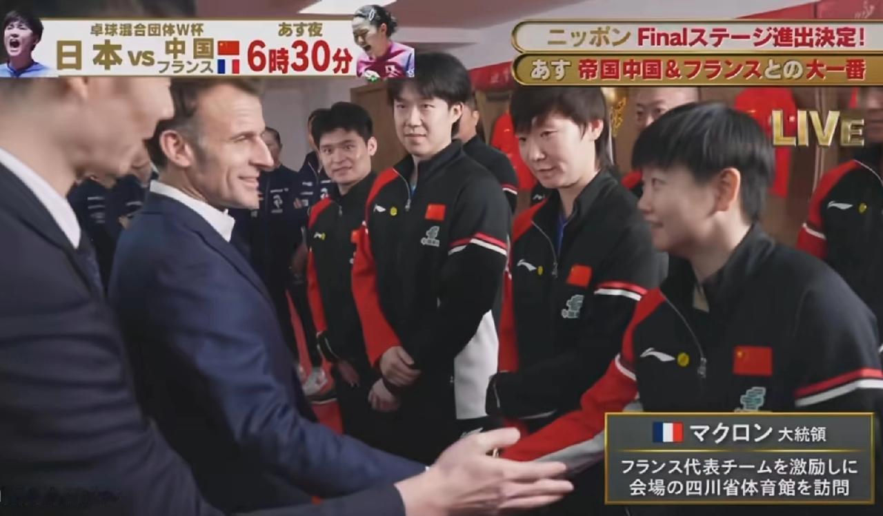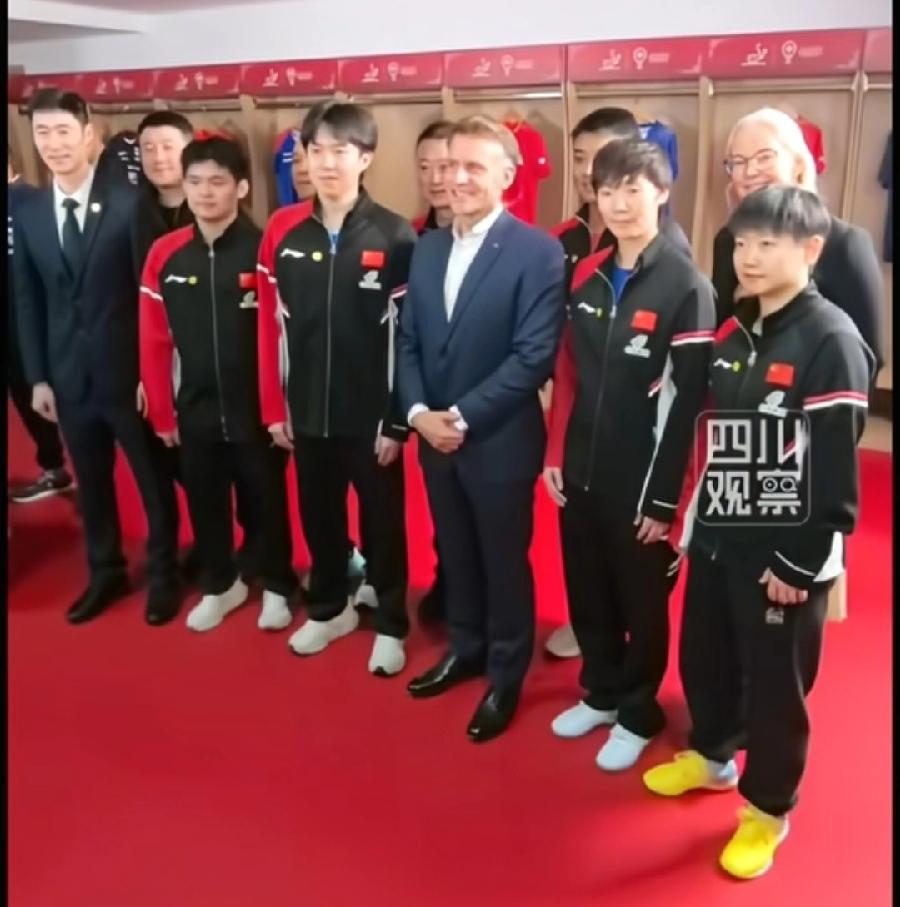 马克龙与孙颖莎、王曼昱、王楚钦、林诗栋握手,还有国乒主席王励勤一起合影,王励勤赠送马克龙一件国乒红色球衣,马克龙与法国乒乓球员勒布伦、女球员组队,与王楚钦、孙颖莎组合,打混双友谊赛,马克龙打的有模有样,现场氛围热闹而友好!体育无国界,乒乓外交意义深远,欢迎马克龙再次来华!