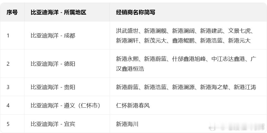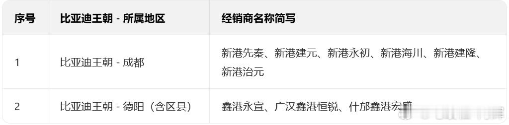 比亚迪10大经销商集团数据来咯!!!今天讲的是成都新港集团。 可能迪友没有听过,就是目前博主“正经迪吹”所在的比亚迪集团,你们认识迪吹吗?成都新港集团成立于2001年10月。自2002年起一直入围四川省和成都市政府定点维修采购单位和成都市政府公务车定点采购维修单位。同时,它也是比亚迪汽车授权成都市一级销售服务代理商,代理比亚迪汽车销售及售后服务。 据统计目前拥有超:9家王朝网 22家海洋网 9家方程豹 7家腾势 ,合计47家4S店,含上17 家城市展厅及商超零售店,共有70 多家二级网点。以下图片有4S门店的明细统计。新网点下次继续更新中......新港集团在2025年最新排名中斩获百强汽车经销商的63名,以及新能源汽车经销商的第10名,在老板陈洁的运筹下,新港在比亚迪集团中算是新媒体做的最好的一家! 其主营产品为比亚迪王朝系列和海洋,后面新增腾豹系列,也是主营比亚迪的经销商集团。2022年起销售业绩稳居西部8个省、地区第一,2024年营业额超过70亿。 新港集团旗下有众多门店,如比亚迪王朝成都新港海川店、比亚迪王朝成都新港先秦店、比亚迪海洋成都新港浩蓝店、比亚迪海洋成都新港澜阔店等。其中,成都新港先秦店是比亚迪品牌旗舰店之一,于2023年4月正式营业,占地面积4500平方米,拥有900多平米的豪华销售展厅,超过3000平方米的售后服务中心。 继2022年荣获金扳手服务百强 作为比亚迪品牌全国战略核心销售服务代理商集团,成都新港集团以专业与实力在新能源汽车领域稳步前行。 有没有朋友在成都新港集团旗下比亚迪买过车,说说你的感受,下一期我们将继续聊比亚迪10大经销商集团-浙江东江集团!创作不易,欢迎点赞关注!