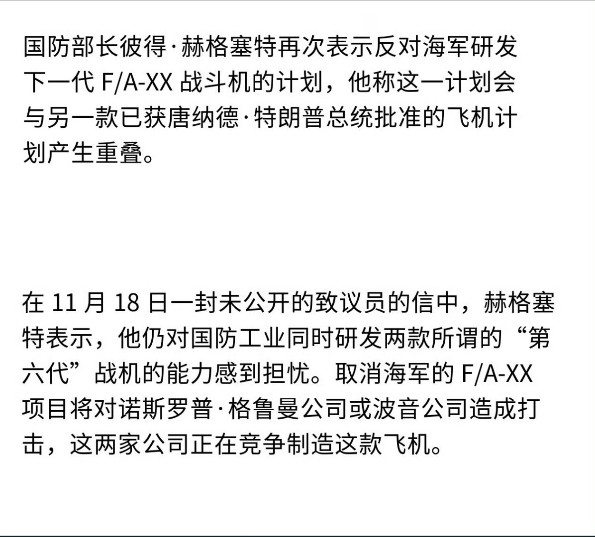 美国国防部长赫格塞斯坚决反对美国海军下一代的F/A-XX计划理由是与特朗普批准的美国空军F-47六代机项目计划重叠,且对美国国防工业同时开发两款六代机的能力感到担忧。烽火问鼎计划
