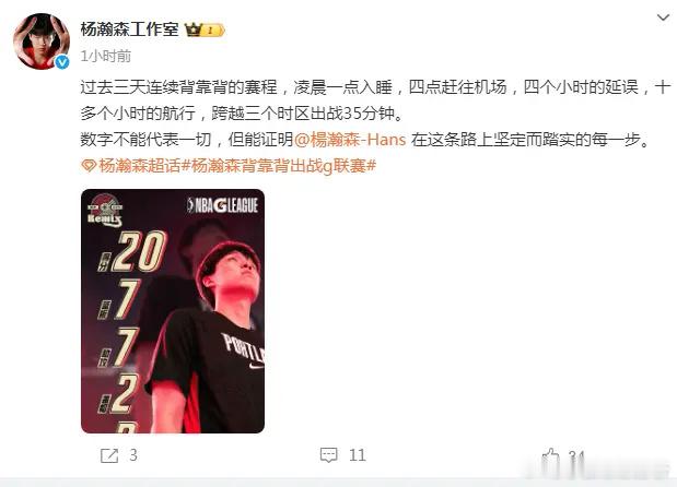 工作室晒杨瀚森连轴转:只睡3个小时赶飞机 混音主帅盛赞进步很大 北京时间12月5日,杨瀚森在下放到发展联盟后,贡献20+7+7+2+2+2三分的全能表现,杨瀚森的连轴转作战让工作室晒出他的辛苦经历。撕裂之城混音主帅乔纳-赫斯库赛后也是高度评价杨瀚森,称赞他在进攻端的能量,尤其是拥有出色的组织才能,也表扬他的英语沟通能力显著提升。开拓者在12月3日与4日均有比赛,但杨瀚森缺席了12月3日对阵猛龙的比赛,之后在12月4日对阵骑士的比赛,杨瀚森替补登场5分多钟,借助罚球得到2分。杨瀚森随后连夜赶回波特兰参加发展联盟的比赛,虽然撕裂之城混音主场加时128-135惜败圣迭戈快船,但杨瀚森首发出战35分09秒,进攻端14中7,其中外线三分6中2与罚球4中3,得到20分7篮板7助攻2抢断2盖帽的全能数据。如今杨瀚森工作室发声讲述杨瀚森的背靠背靠背经历:“过去三天连续背靠背的赛程,凌晨一点入睡,四点赶往机场,四个小时的延误,十多个小时的航行,跨越三个时区出战35分钟。”“数字不能代表一切,但能证明杨瀚森在这条路上坚定而踏实的每一步。”至于撕裂之城混音主帅乔纳-赫斯库对于杨瀚森给出高度评价:“杨瀚森今天早上才赶到球队,他上场35分钟表现很出色,我认为比赛总是从防守端开始,他的存在感很不错。”“不过他们还是有多次陷入被动局面,他没能有效干扰投篮,但一旦参与进攻就表现得很出色,这位全能型球员一旦启动,就总能创造良机。众所周知,杨瀚森的组织能力很出色,所以这次表现还算不错,他自己也觉得可以打得更好,我们会继续知道他,他会打得更出色。”乔纳-赫斯库还进一步表示:“我觉得杨瀚森的沟通能力提升很大,他能在场上早早发出指令,声音洪亮且持续不断,他的英语理解能力也进步很多。这始终是个持续改进的过程,尤其开场阶段的沟通至关重要,能帮助后卫穿透挡拆,我认为他今天的沟通表现相当不错!”杨瀚森下一场比赛将是12月8日,率领撕裂之城混音对阵南湾湖人。