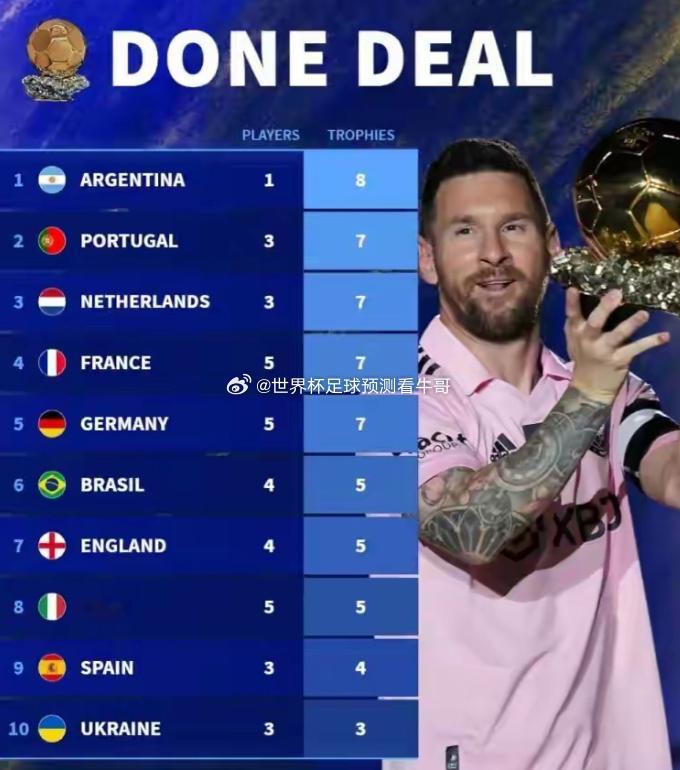 金球奖获奖次数前🔟国家排名:1、第一名:阿根廷(8次)——1人2、第二名:葡萄牙(7次)——3人3、第三名:荷兰(7次)——3人4、第四名:法国(7次)——5人5、第五名:德国(7次)——5人6、第六名:巴西(5次)——4人7、第七名:英格兰(5次)——4人8、第八名:意大利(5次)——5人9、第九名:西班牙(4次)——3人10、第十名:乌克兰 (3次) ——3人