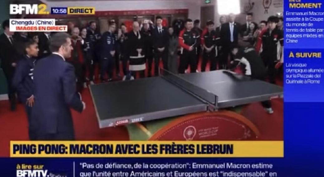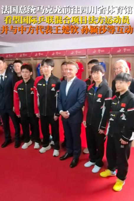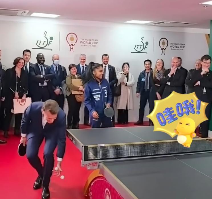 马克龙打乒乓球,拿球动作有模有样,还和专业运动员切磋球技!12月5日马克龙访问四川省体育馆,还与乒乓球运动员王楚钦打球,而且总统先生毫无架子,乒乓球掉在地上了亲自捡球。 还是头一次看法国总统打球,估计他之前也练过,不然也不会和专业运动员对打,只能说总统爱好广泛,健身不光是说说或者跑步,私下里肯定也练习打乒乓球了。 总统先生和运动员打完球后还与他们合影,站在运动员中间很有辨识度,毕竟运动员都穿着运动服,只有他穿着西服与白衬衫。