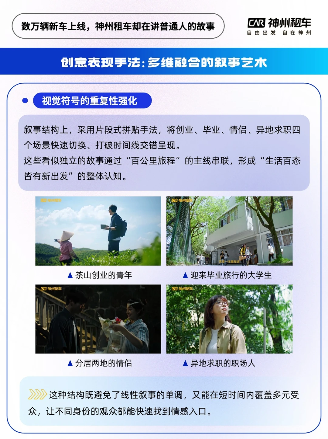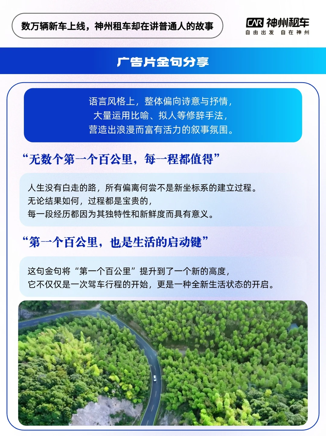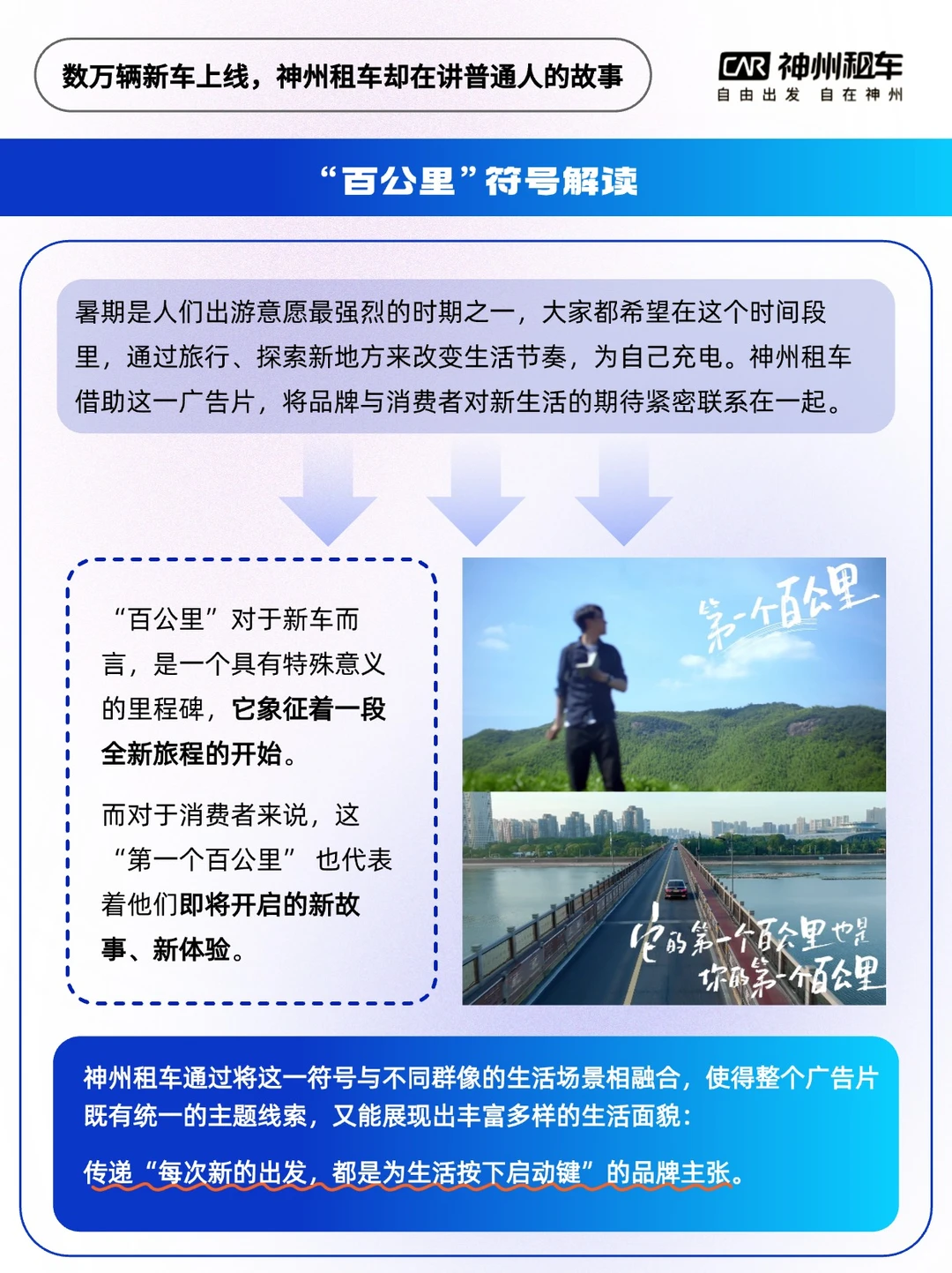 - 神州租车的品牌广告片,一直以捕捉生活片段中的细腻情感出名,能超越它的,或许只有它自己。 🔵近期,它又推出了一条名为《第一个百公里》的品牌TVC,借着数万辆新车上线的契机,在暑期这个出行旺季狠狠刷出存在感。没有走宏大叙事的路子,而是把镜头对准了普通人的生活片段。 片子把“第一个100公里”当成了贯穿始终的线索🚗 这100公里,是新车的第一个百公里,也是普通人丈量生活的标尺,巧妙地降低了用户共情门槛。 对毕业青年,这是从校园到旷野的过渡距离; 对情侣而言,是每周奔赴的思念半径; 对创业者,或许是翻越山坳迎来晨光的临界点; …… 广告的本质是“看见”, 神州租车的高明之处在于, 叙事中脱离了宏大的“征程”或“梦想”, 而是把共情藏在对生活的细节刻画里。 第一个百公里,无论你去哪里, 都是里程表上最崭新的记忆。 新人新车新故事,它不承诺百公里外必有美景,但承认你的每次出发都值得尊重与期待🌸 神州租车数万辆新车静待启程,你的第一个百公里,也该出发了~