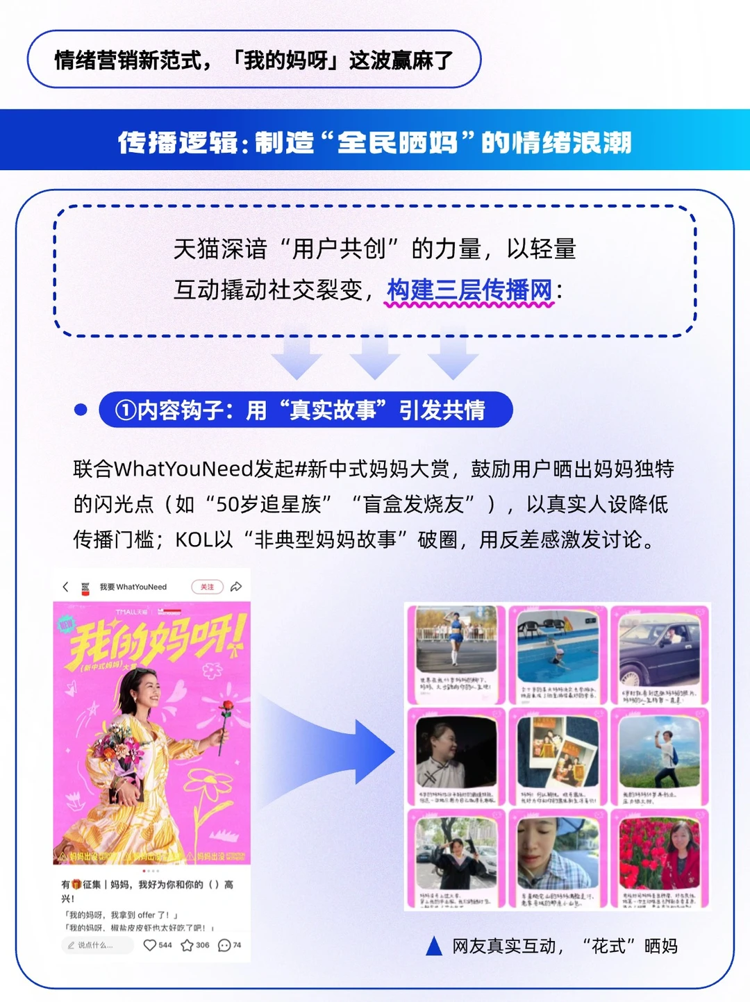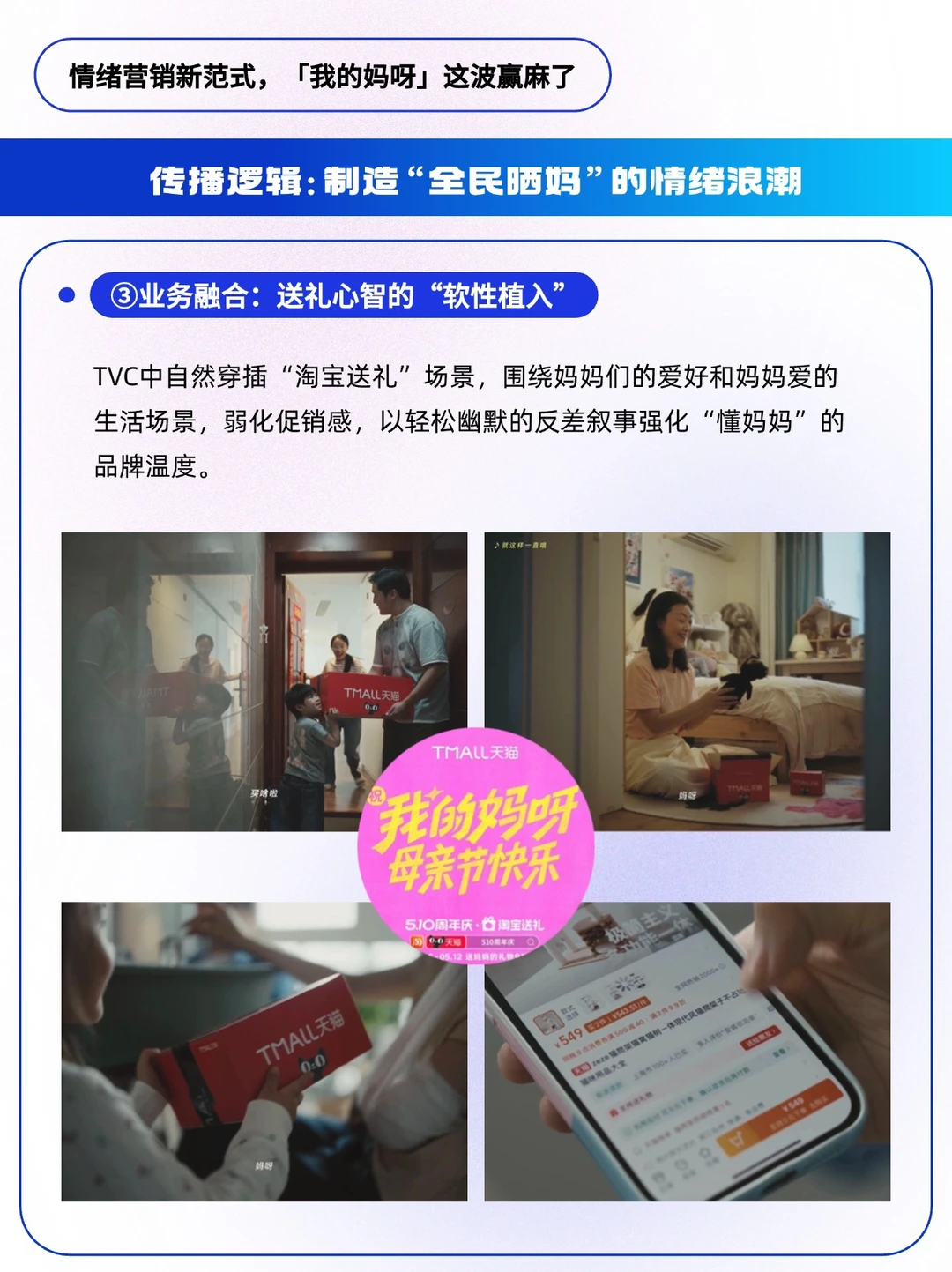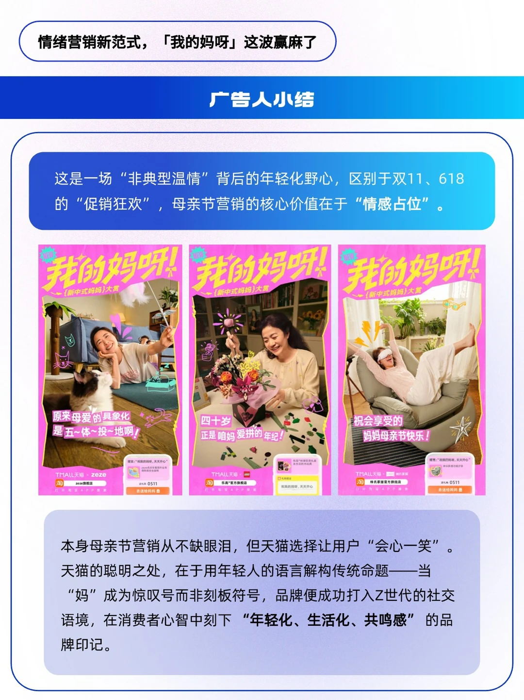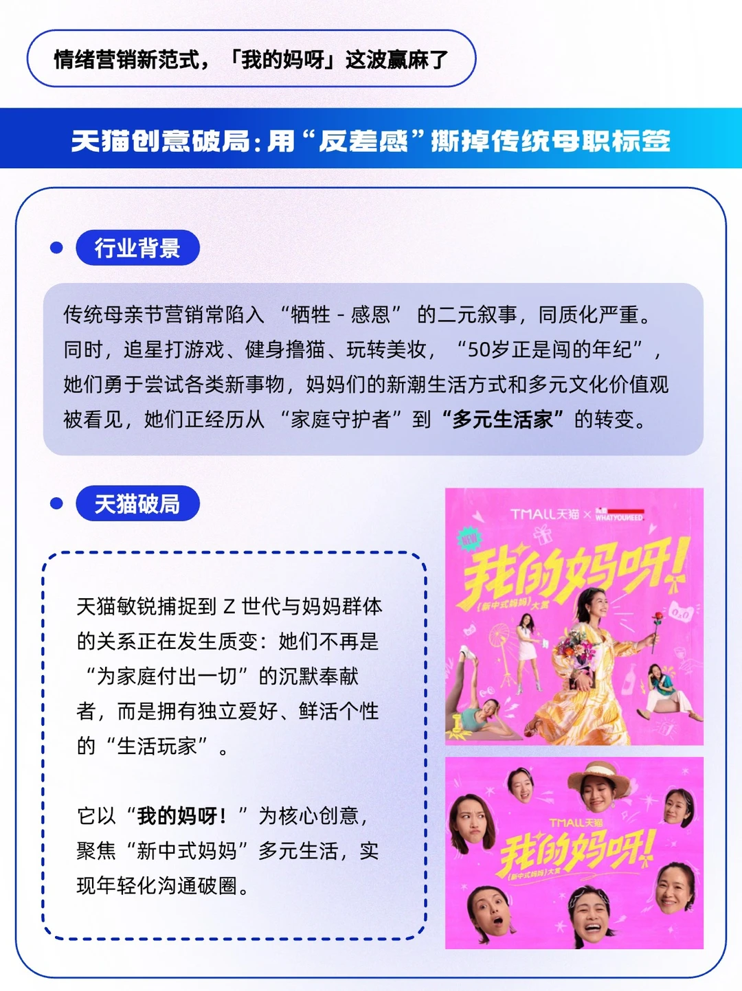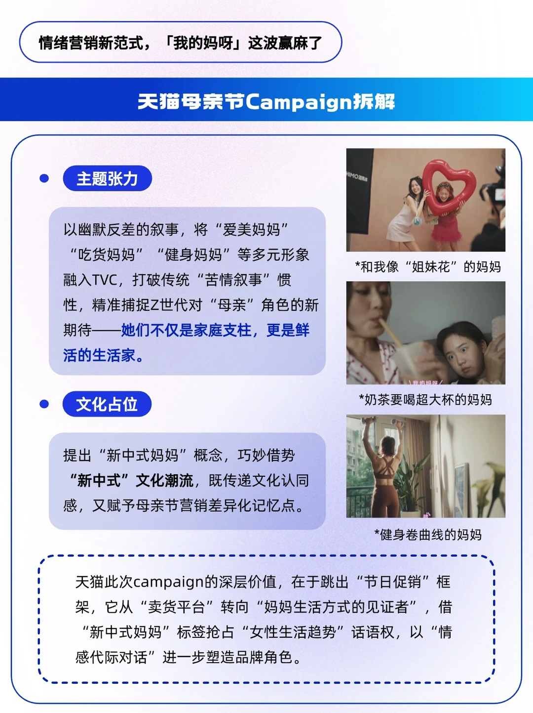 - 母亲节营销从不缺眼泪, 但天猫选择让用户“会心一笑”。 🔵天猫敏锐捕捉到 Z 世代与妈妈群体的关系正在发生质变:她们不再是“为家庭付出一切”的沉默奉献者,而是拥有独立爱好、鲜活个性的“生活玩家”。 在这个母亲节,天猫用一句年轻化的惊叹——“我的妈呀!”,聚焦“新中式妈妈”多元生活,完成了对母亲形象的重构,实现年轻化沟通破圈👍🏻 这场campaign的终极启示或许是: 让妈妈做自己,才是最好的节日礼物。