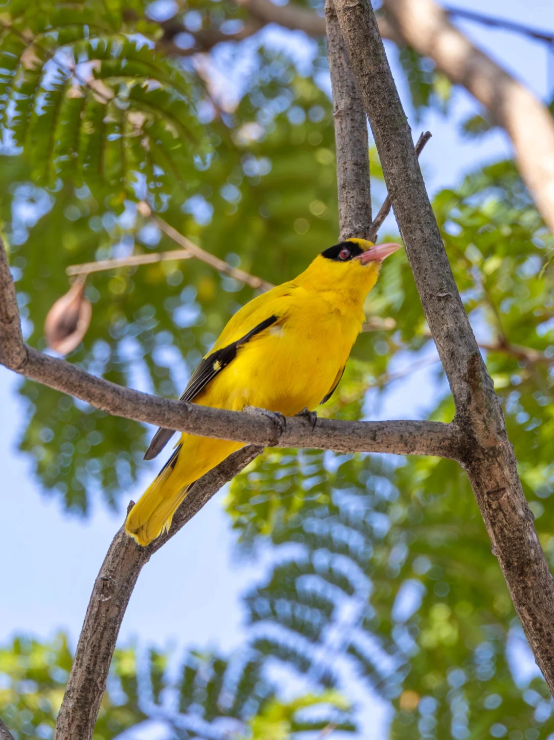 原创拍摄于2025.01 黑枕黄鹂,雀形目黄鹂科黄鹂属。 黑枕黄鹂是一种非常漂亮的鸟,金黄色,一条宽阔的黑过眼纹,粉红色嘴,在阳光下超级靓丽。 两个黄鹂鸣翠柳,不过我倒是从来没见过黄鹂站柳树。