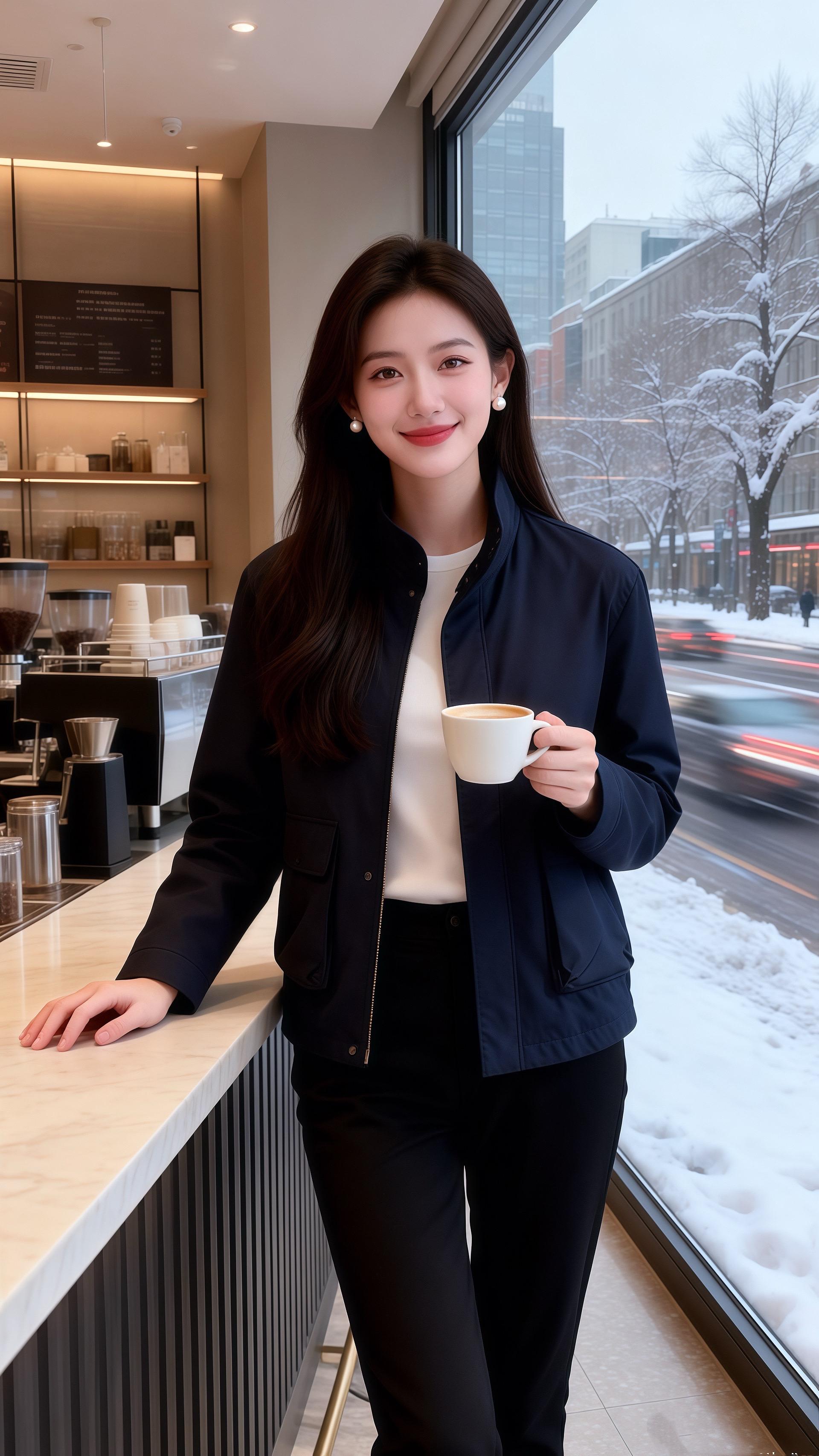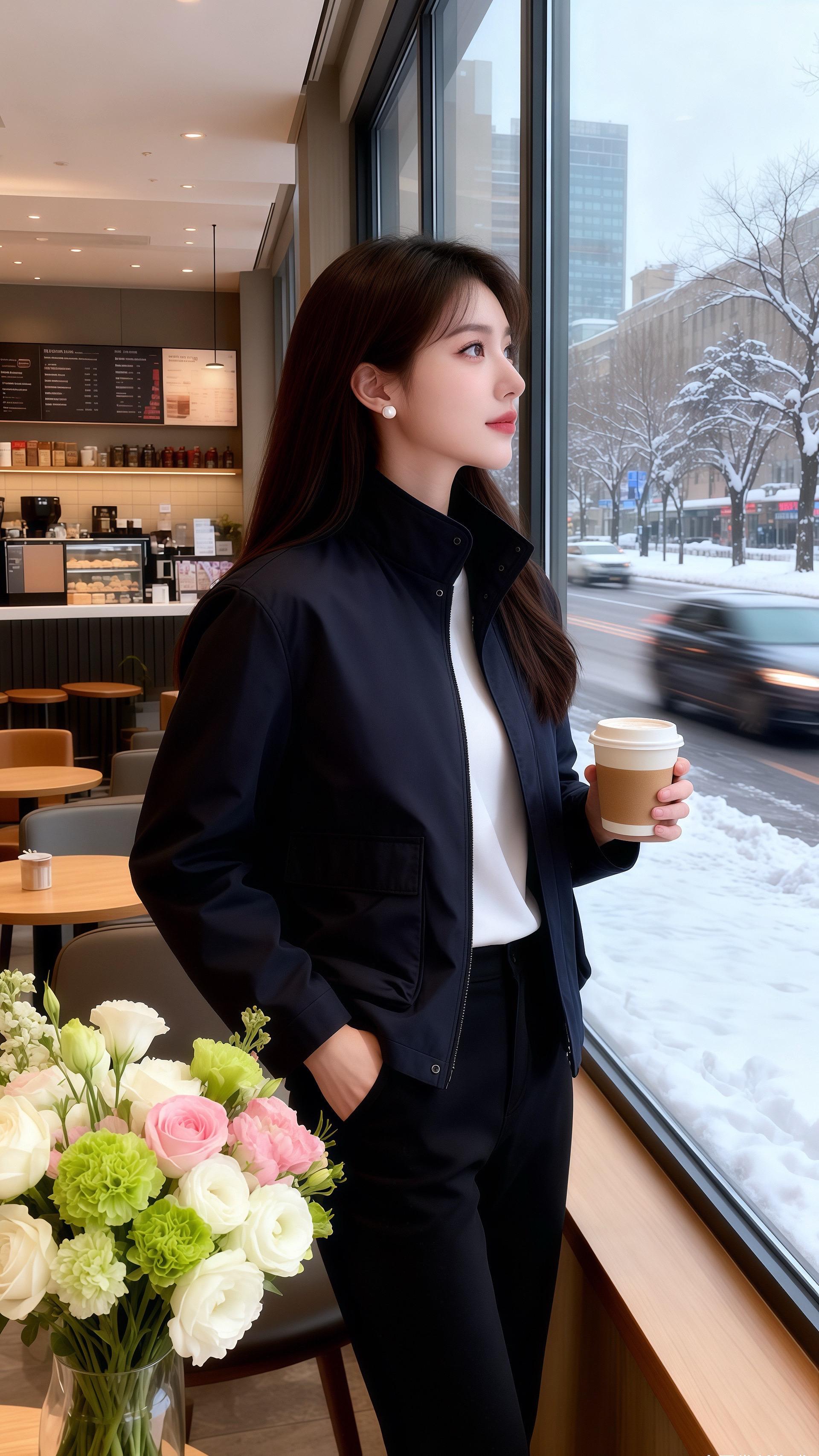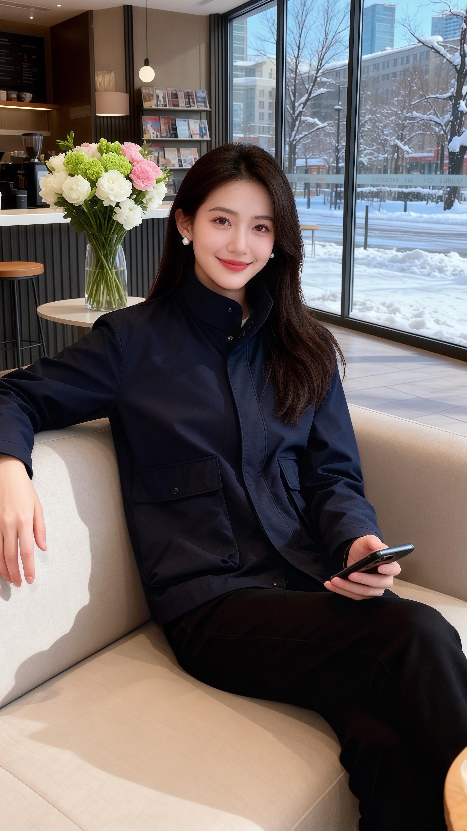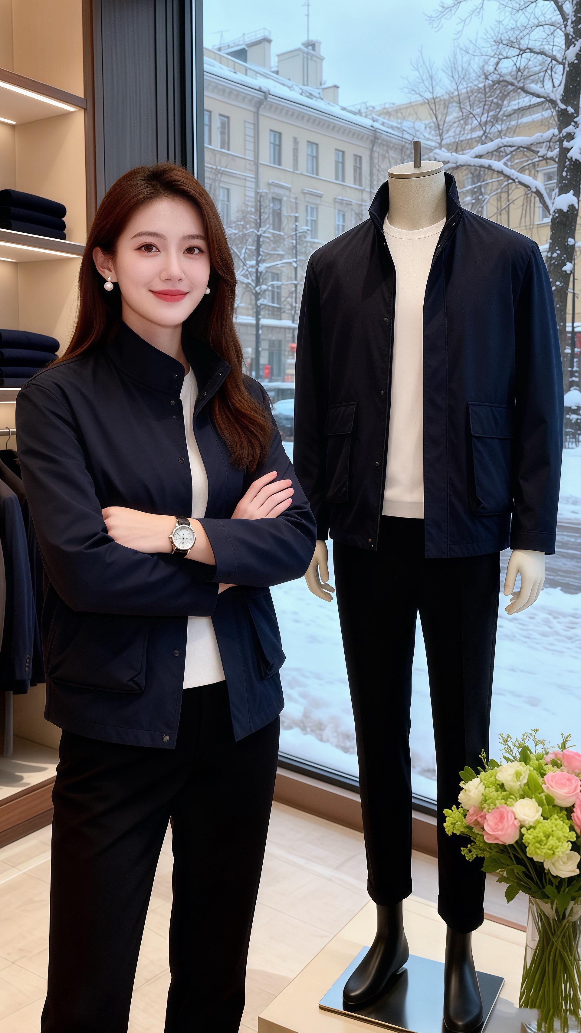 她穿藏青色立领外套,面料带着顺滑的质感,胸前的贴袋让简约的衣身多了几分利落的设计感,拉链半开露出内搭的米白打底衫,冷调的藏青与柔和的白相撞,衬得肤色愈发温润。下装是黑色长裤,裤型宽松却不失版型,和外套的休闲感相融,整身穿搭像冬日里的深海礁石,沉稳的藏青裹着温柔的细节,连桌上的花束都成了点缀。