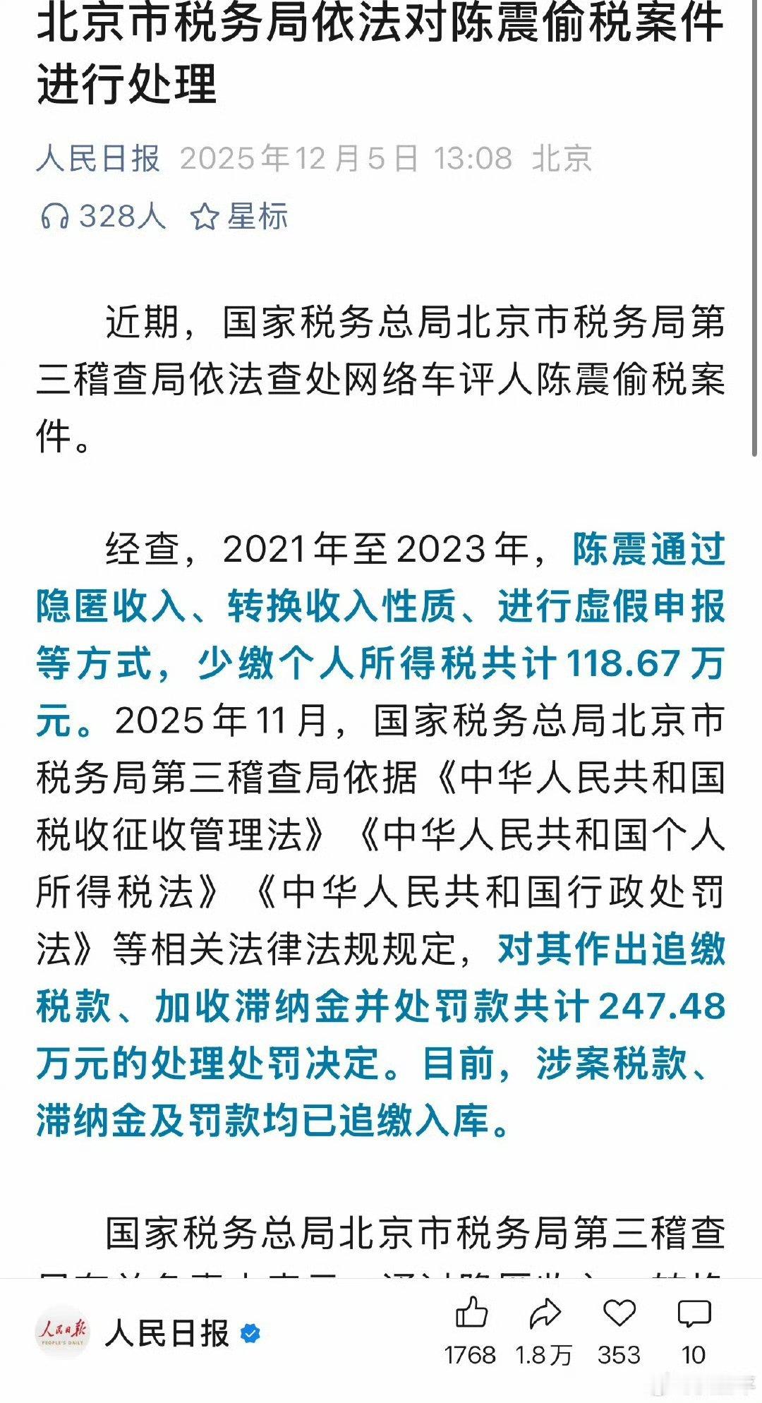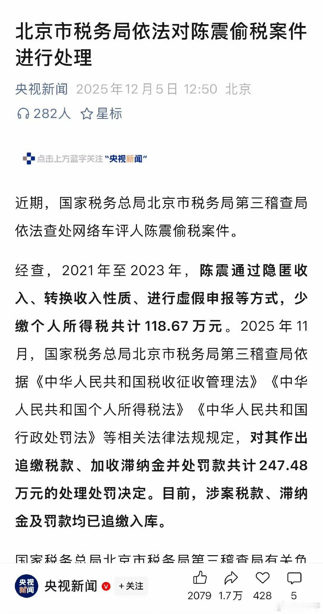 就算上了新华社、人民日报、央视新闻,也不能骄傲 陈震偷税追缴并罚共计247.48万元 陈震偷税案