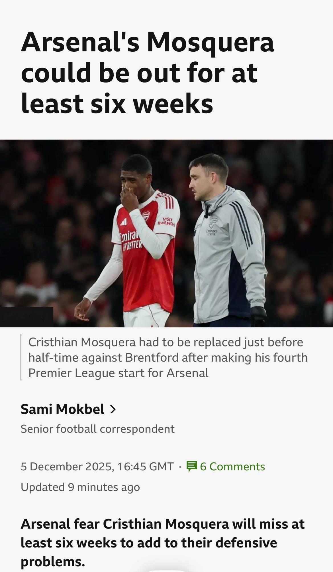 BBC Sami Mokbel:阿森纳后卫莫斯克拉因脚踝受伤要休养6到8周……早日康复。阿森纳,顶住呀