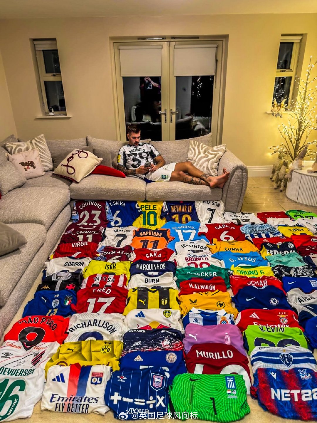 【球衣收集控】纽卡斯尔中场布鲁诺-吉马良斯,在家里的大厅,展示他收集到的球衣,当中有不少是在英超交手过的球员。