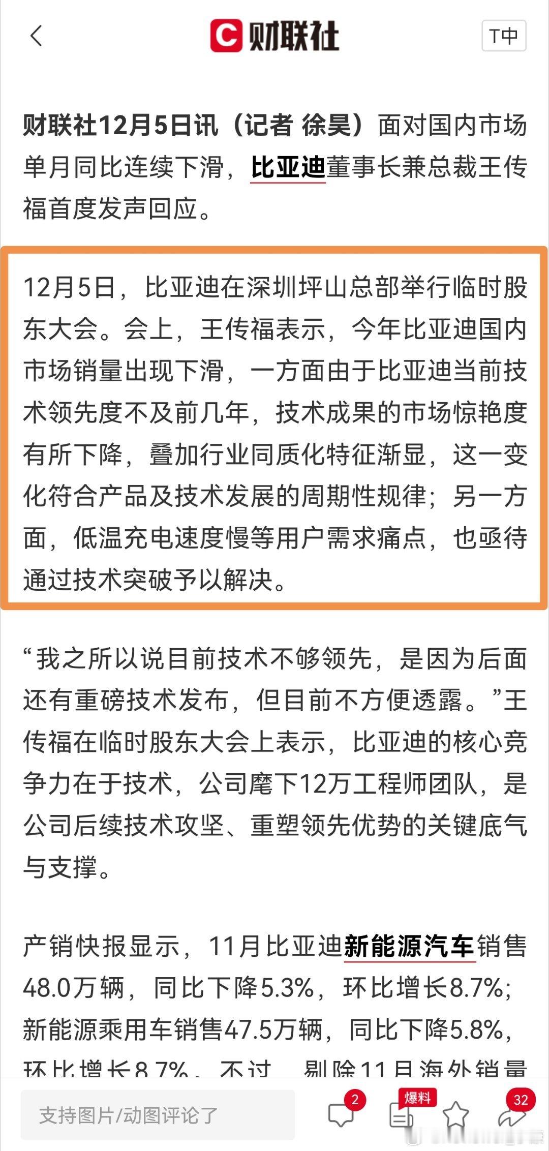 总裁还是挺客观,比亚迪当前技术领先度不及前几年。的确,靠着老本吃到今天,越是这样其实等于“逆水行舟”。品牌形象不够新,当年“汉车型”没有很好延伸下来。王传福回应比亚迪国内销量下滑