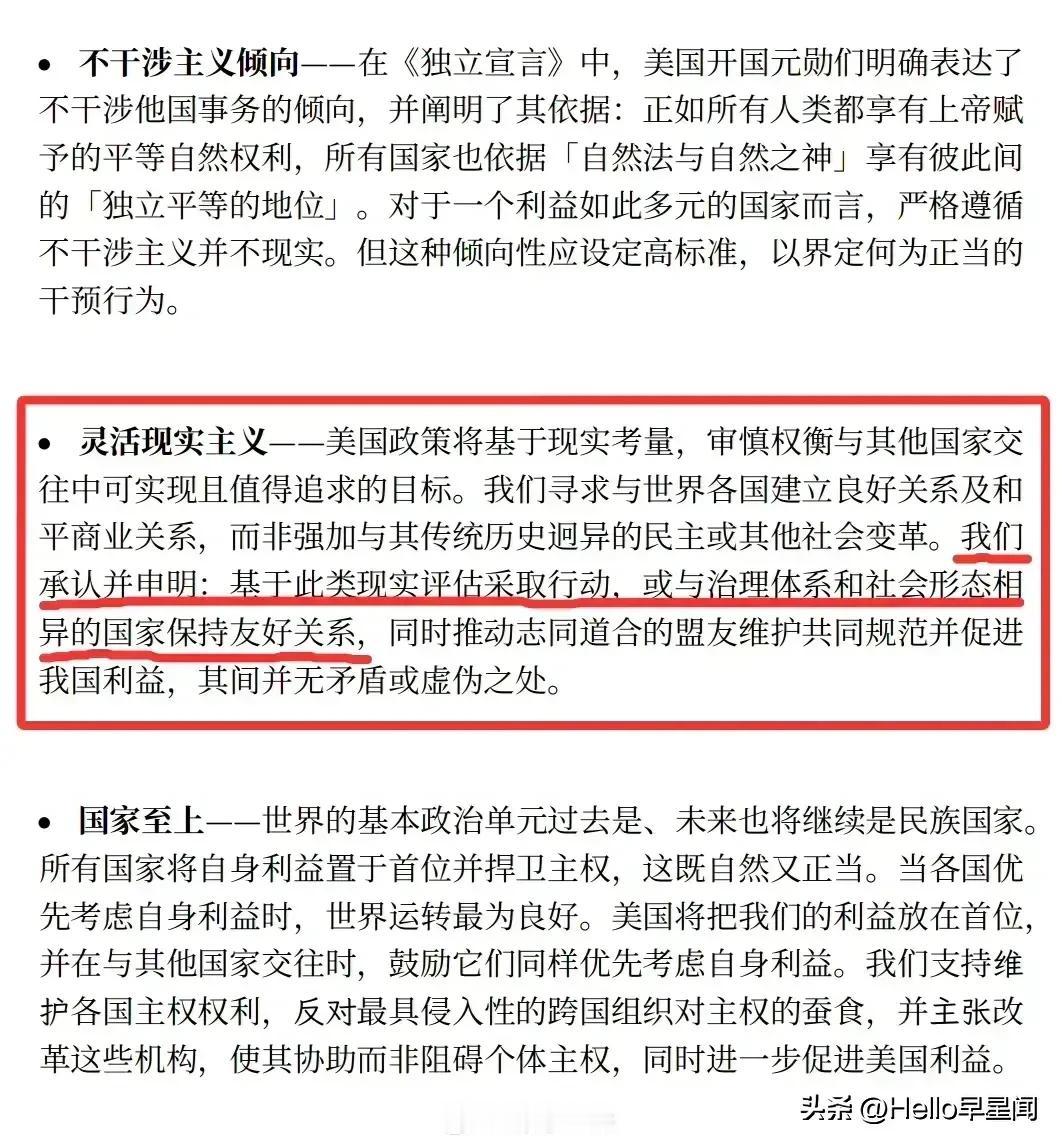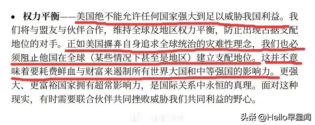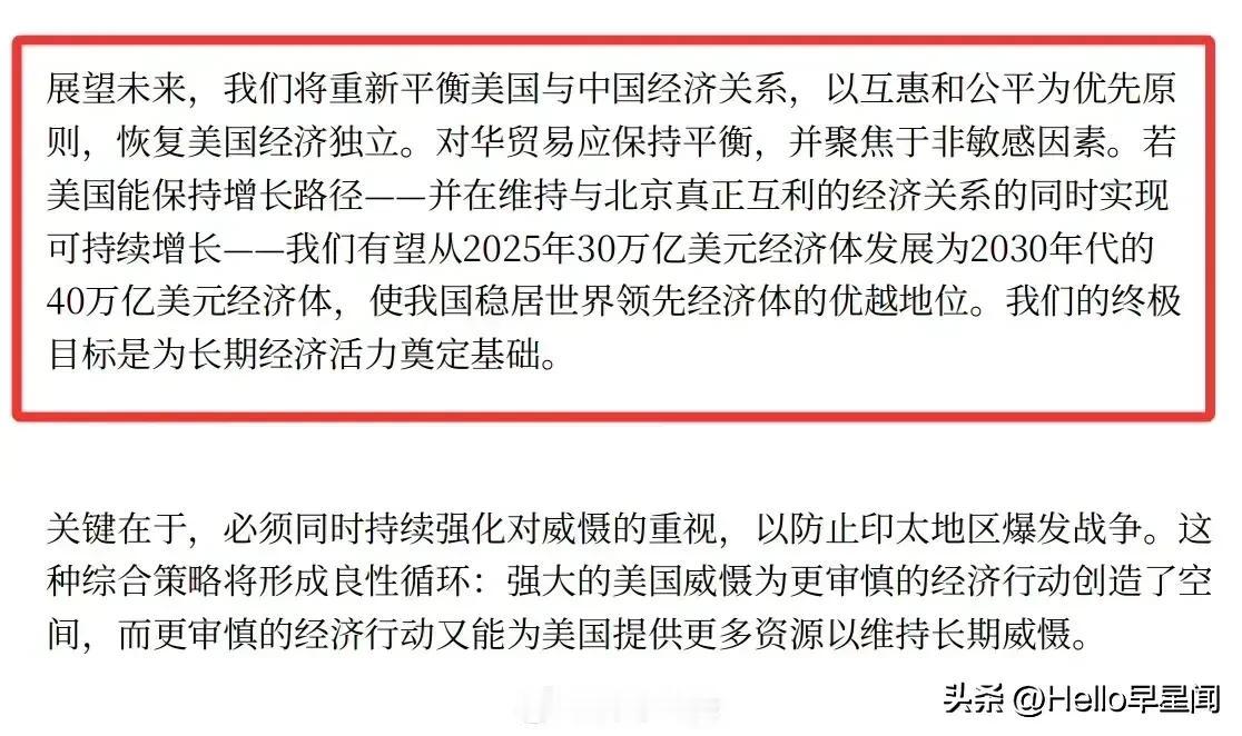 美国战略出现重大转变: 淡化重返亚太与中国对美威胁…… 美国12月5日发布了《2025国家安全战略》,其中有三点: 一是,在美国利益优先的情况下实行全球灵活性政策; 二是,淡化重返亚太,不再强调以战争流血冲突来获取美国自身利益; 三是,淡化中国对美威胁,重视与中国发展互惠互利外交关系,美国争取继续维持全球第一经济体地位。