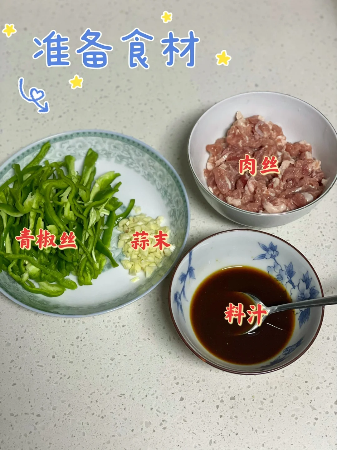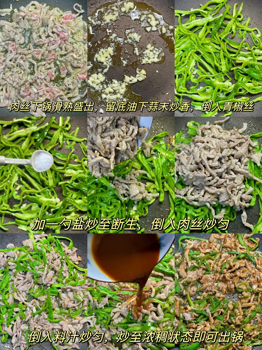 青椒肉丝在家常菜谱里的地位也是无法撼动的了,巨好吃,做法也超简单,来一碗米饭盖上青椒肉丝,简直是太过瘾了😋 🥗食材:梅花肉,青椒,大蒜 1⃣️:肉丝洗净切丝,加入两勺淀粉,少许清水抓匀备用,青椒切丝,大蒜切末 2⃣️:锅中倒入适量油,油热倒入肉丝滑熟盛出,倒蒜末炒香,倒青椒,加入一勺盐炒至青椒断生,再倒入肉丝炒匀,最后倒入料汁炒匀即可