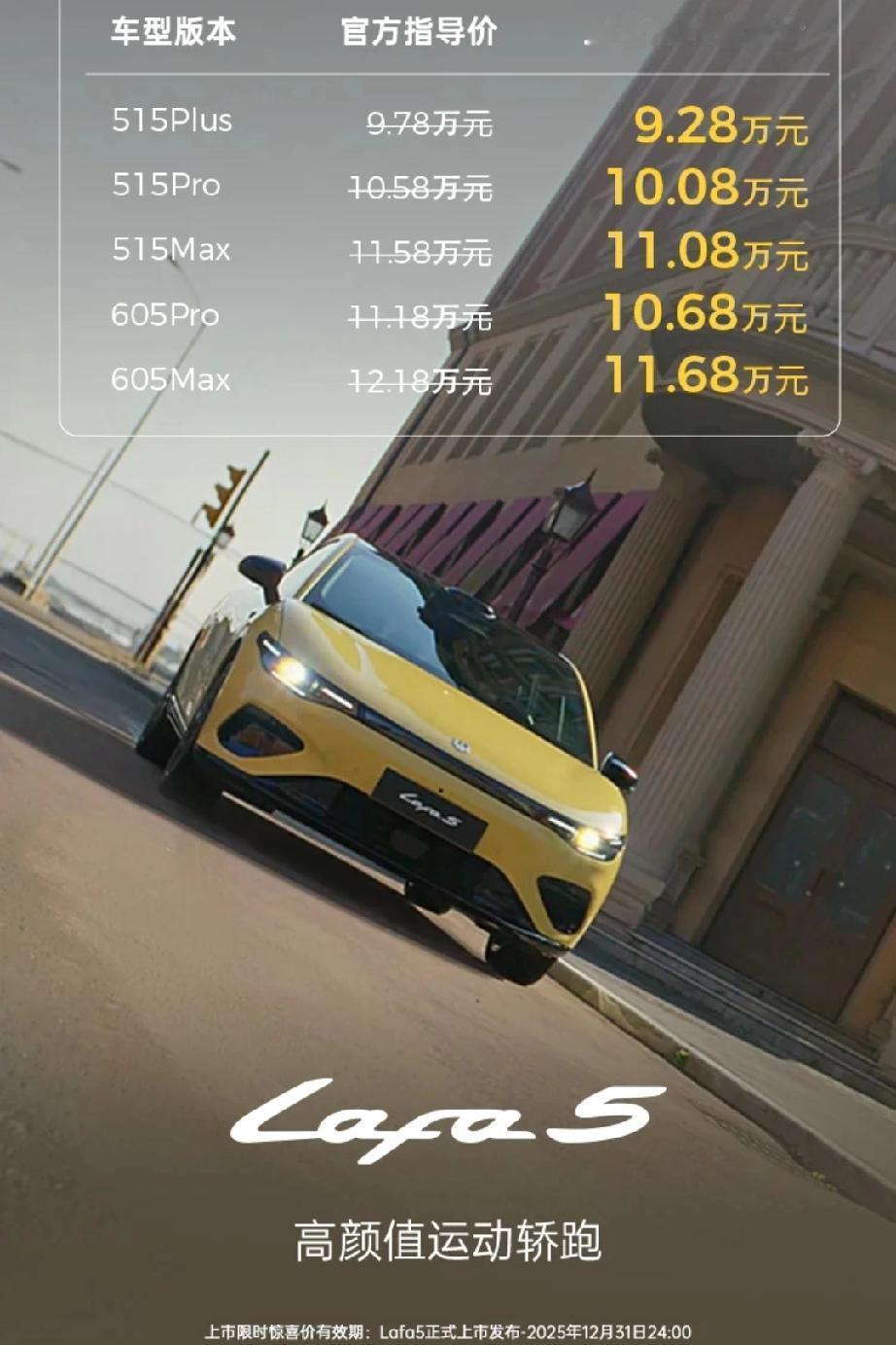 邂逅零跑Lafa5,开启年轻新征程,2025广州车展,是一场汽车界的盛宴,而零跑Lafa5则是这场盛宴中最耀眼的主角之一。它以独特的魅力,成为了年轻人心中的“新宠儿”。预售的开启,如同吹响了集结号,吸引着无数年轻消费者的目光。10.58万 - 13.18万元的预售价区间,为年轻人提供了一个触手可及的汽车梦。11月27日的正式上市,以及2026年二季度Ultra版的即将到来,都让这份期待变得更加浓烈。 外观上,零跑Lafa5宛如一件精美的艺术品。宽体低趴的造型,展现出超运动的气质,仿佛在诉说着它对速度与激情的渴望。无边框车门与隐藏式门把手,是科技与美学的结合,每一次开启都像是在揭开一个神秘的面纱,仪式感十足。电掣黄、摩根粉的色彩搭配,活泼而又时尚,让人一眼就难以忘怀。车尾的精致设计,更是为它的整体造型增添了一抹亮色。 车内空间是零跑Lafa5的一大亮点。4.43米的车长和2735毫米的轴距,营造出了宽敞舒适的乘坐环境。后排乘客也能享受到充足的腿部空间,不再有局促之感。副驾的“魔术扩展岛台”,是一个充满创意的设计,它可以收纳各种物品,为旅途增添了更多的便利。车内软包覆盖率超80%,高配座椅的舒适触感,让人仿佛置身于豪华的座舱之中。 智能化是零跑Lafa5的核心竞争力之一。强大的芯片支持,让车机系统运行流畅,识别精准。辅助驾驶功能的加入,为驾驶安全提供了更多的保障。零跑Lafa5,以其超高的性价比和出色的性能,成为了年轻人开启新征程的理想伙伴。