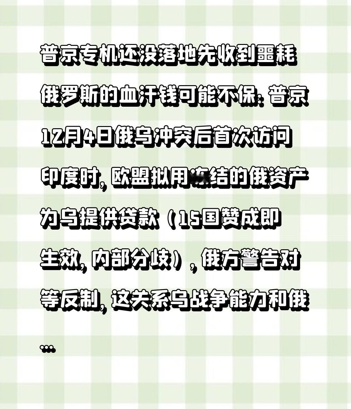 普京专机还没落地先收到噩耗 俄罗斯的血汗钱可能不保:普京12月4日俄乌冲突后首次访问印度时,欧盟拟用冻结的俄资产为乌提供贷款(15国赞成即生效,内部分歧),俄方警告对等反制,这关系乌战争能力和俄重大损失。