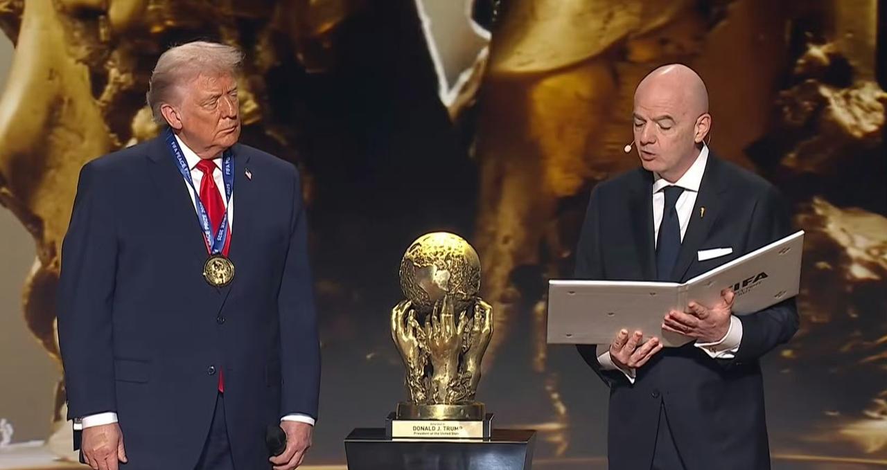 在世界杯抽签仪式前,国际足联主席因凡蒂诺向美国总统特朗普颁发了“世界和平奖”,表彰他在全世界推进和平与团结所作出的非凡努力。 国际足联很懂人情世故,🏆和🏅都够大够金。 大统领看起来很满足。